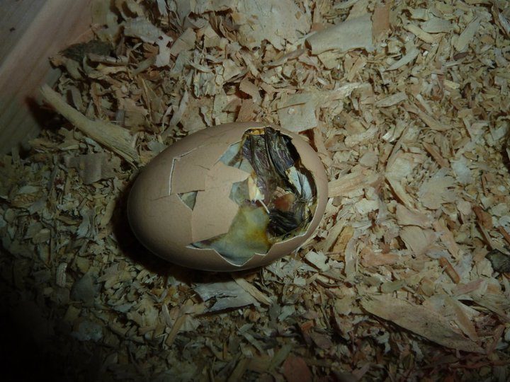 Her name was "Santas Little Helper", (she hatched on Christmas Day 2010) but I called her Lil'bit. She was in my very first hatch out, there were 2 others that hatched the day before (Christmas Eve), thats probably how her egg got crushed. I noticed it was stepped on in the morning, I looked at it and put it back hoping that she could get out on her own, I waited till around 3:00 or 4:00 in the afternoon before I interviened. (she was under a broody)... here are the pics;
