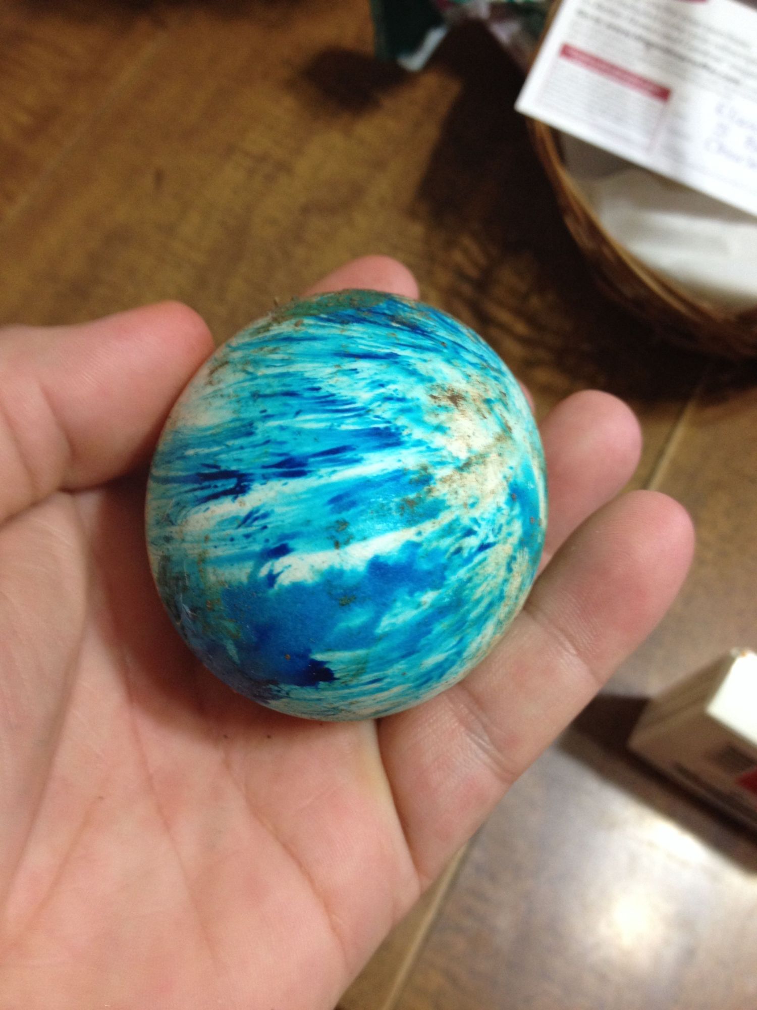 LOL, so I guess using this one as a Christmas ornament is out of the question? I guess you could though it already has some pretty color on it. you'd always know who's egg it is.You can see the feathered "brush strokes" as it came out. It was funny she had it hidden in the hay in the nest but i could see the bright blue showing through the hay, i almost cracked my noggin diving in after it when i opened the peep door. Then almost ran to the house to show everyone saying the whole way "dont drop it, dont drop it"
