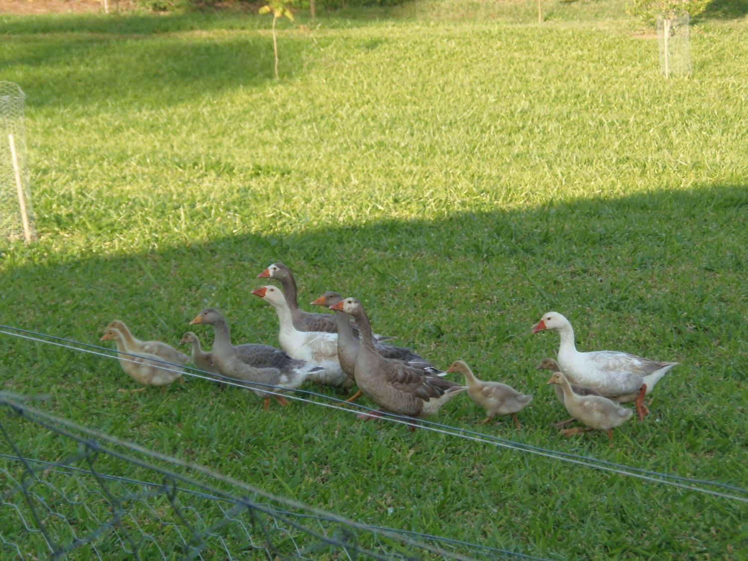 The 2 older goslings plus mum and dad, plus the undergoose and her six have made a flock. They look great wandering around the place. We can see them in the stream, then they come up to the house, then wander back down again....