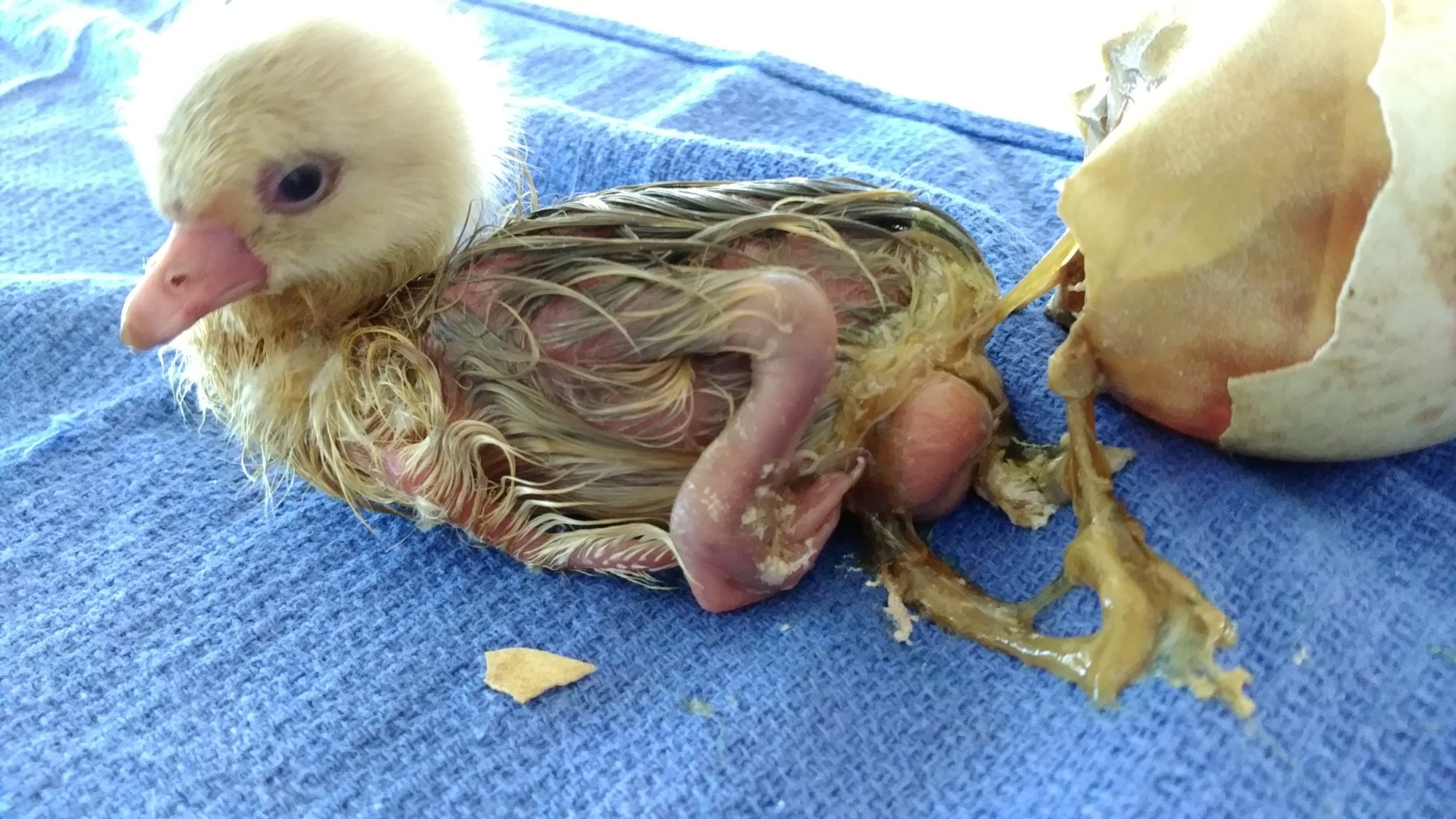 So I successfully removed the shell and she pushed her way out. There was no blood whatsoever but there was a lot of slime that smelled rotten. But... the gosling doesn't seem normal to me. She's very shaky and can't unroll her feet. They're all clenched up. She also seems to have something rather large and raw looking (but not bloody) herniated out of her navel. I cleaned her up really good, sprayed the herniated portion with Vertycin and put it back under the hen, who seemed happy to see her.