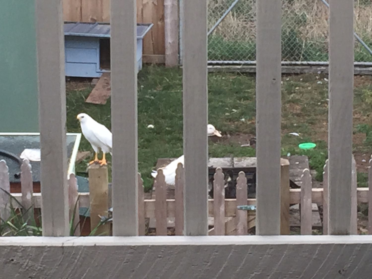 I woke up the other morning to an almighty kerfuffle from the fowl yard. When I looked out there was a beautiful all white goshawk perched on the fence checking out the 8 duckling buffet. She flew off when she saw me but came back later. Normally if something disturbs the ducks (like me) they all run around the back of the shed where there is a bit of a "jungle" as I call it. This time the ducklings were all sat on the pond, very still and bedraggled, while their mama Wendi and older sister Singlet stood over them on the side. Father Bob is currently banished outside for non-child friendly attitude.