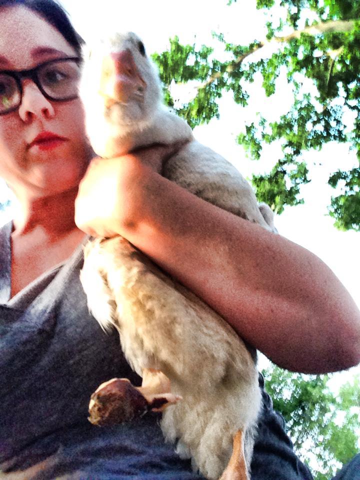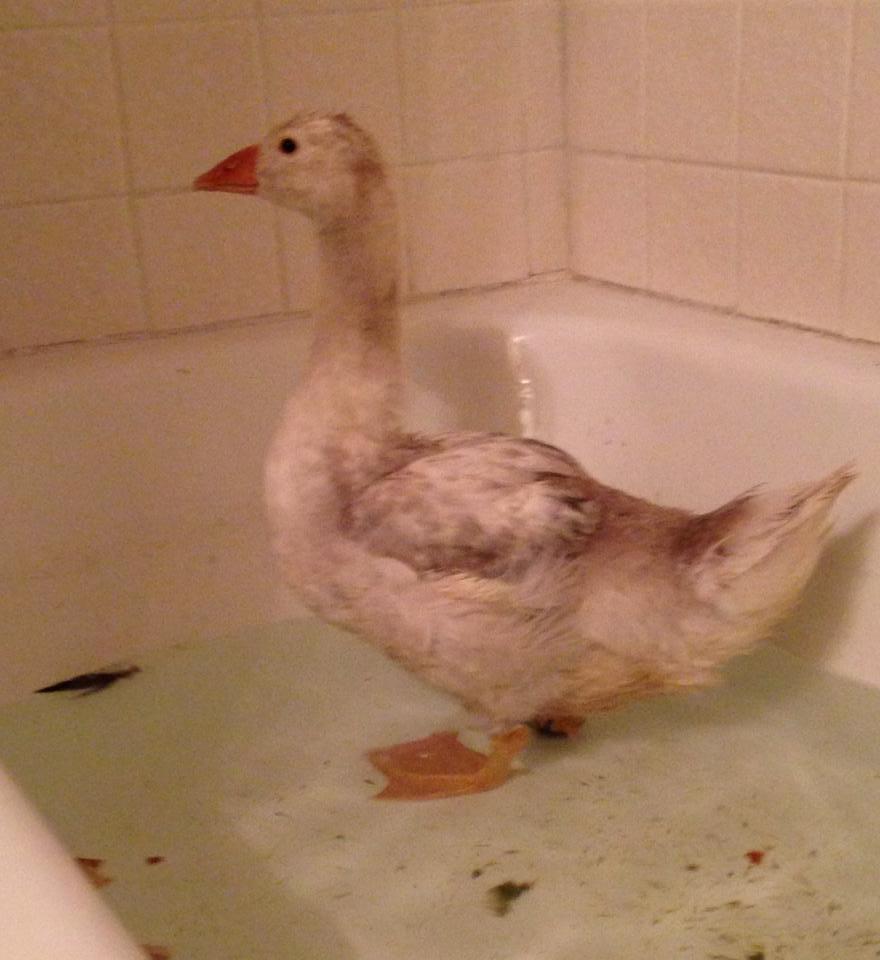yesterday someone dumped this gosling at our local lake. He has a severed foot! The wound is basically healed over, but it will need serious maintenance for a while. I brought him home gave him a clean bath, and dry bedding and he is resting quite comfortably.
