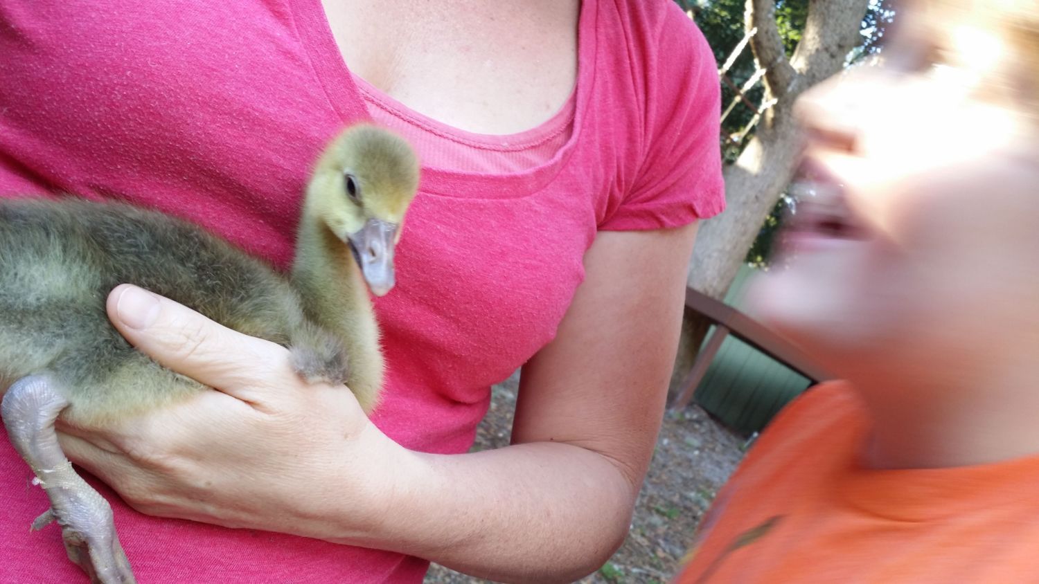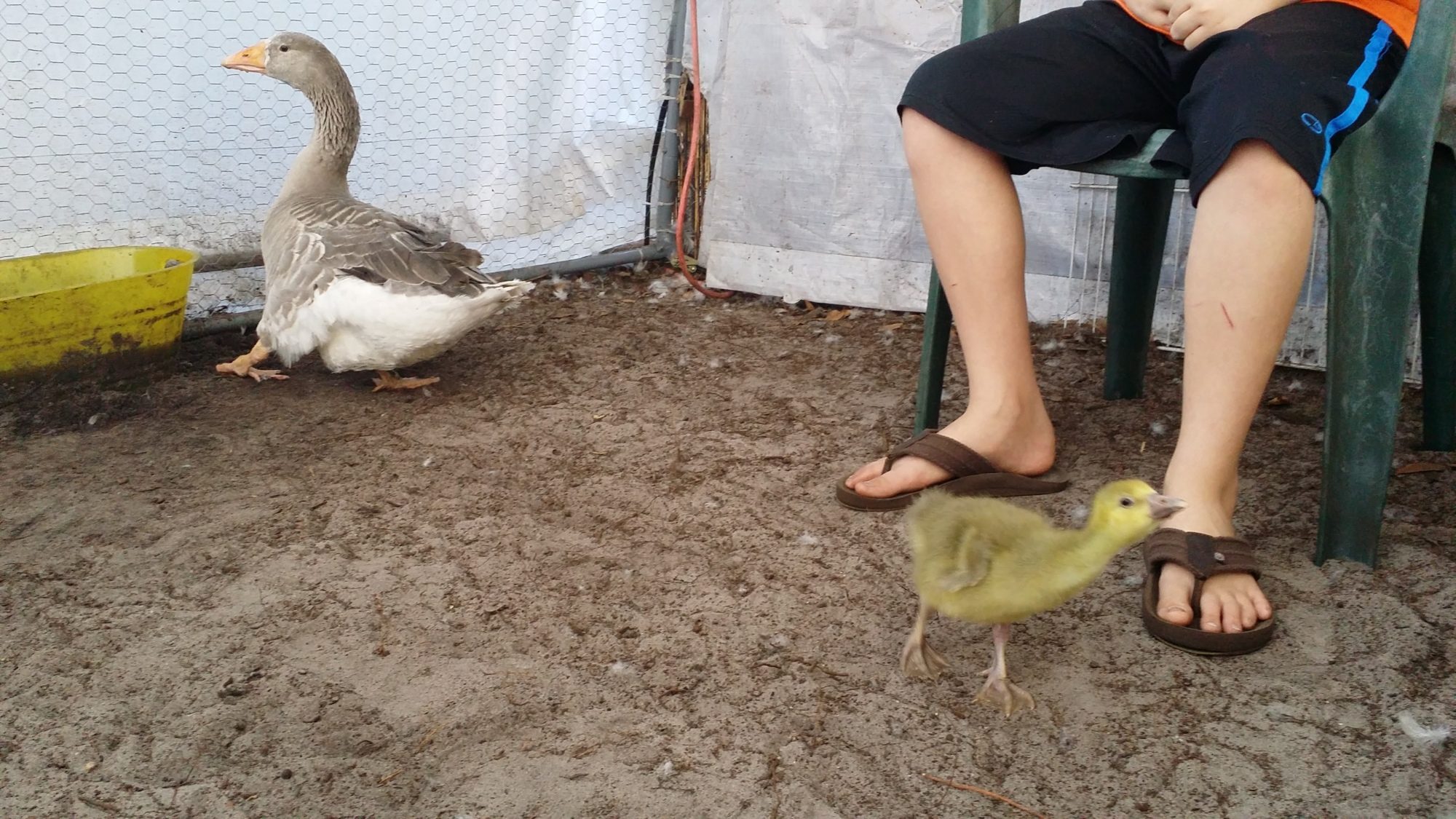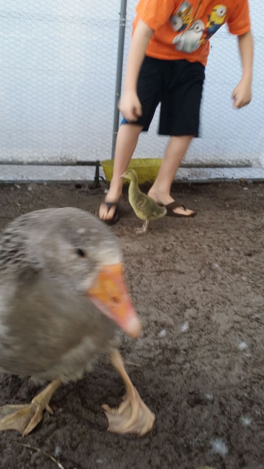 I don't think Ollie would hurt her they seem to know what is their species so let them meet, you'll be right there. Also 80 at 3 weeks is too warm It should be around 72-75* you want to get her acclimated to your house temp. She is adorable and they really are alot of fun. I love to hear those lil feet on the hardwoods too.hi guys! My computer is still messed up. I have a really hard time using my phone. Our gosling (Mandie) is doing good! tomorrow she will be 3 weeks old so far so good with Forest, Ollie and Mandy getting alon. I don't think that my advice will be a good comparison since I have house geese as far as adding the babies with the adults. MandIE is still in her brooder. temperature is about 80. we have taken her out side a couple of days. I am definitely mommy but she knows she is a goose. She is different than Forest she is not afraid of the other birds. Ollie is very interested in her but I was afraid to let him get too close. Forest still wants to peck her but Mandy is much faster than Forest. I am still keeping everybody separated but together Mandie sits and her brooder right beside Forest's crate. MANDIE peeps and peeps and peeps. FOREST has started talking to her when I am NOT in the room I hear them talking which is a good sign. Mandie is a very different bird than Forest personaliy wise but we love her already. she is our first Gosling that can walk around her little running is adorable. I love the way it sounds on my hardwood floors lol![]()
