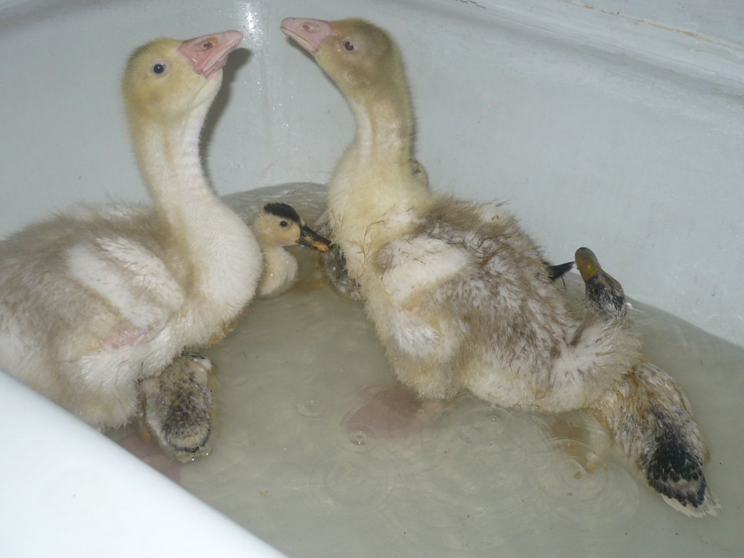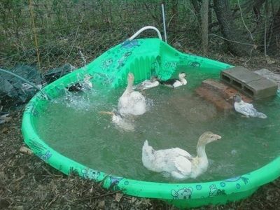 Ha, gotta tell ya'll a story. Had a little 3 lb Spanish Game hen that I gave 3 goose eggs to when she went broody. Only one hatched. They were White Chinese. The gosling was huge at birth, but mom and baby loved each other. As is my practice, she hatched him in a 30 inch square maternity pen, up off the ground. All was well. Baby doubled in size weekly and soon was the size of mom. Being a waterfowl, he made an awfull mess in that small space. I decided to move them to one of my regular pens and see how it went. My pens are 4 X 5 X 4 high and constructed using 2 X 4 welded wire. Of course being a standard pen for gamefowl, it also had a roost. Junior was as big as mamma and in her eyes, there was no reason why this huge baby shouldn't be able to roost. Well, baby was huge, but his wings were tiny and as yet unfeathered. No roosting for him, even if he was inclined to, which he was not. He made so much racket that I became concerned about him attracting predators. Sooo, I put them back in the maternity pen and the resulting show of affection brought a tear to my eye. He was quiet and cuddled with mom like he had missed her for a week. For a couple weeks afterward I moved them from maternity pen to the larger pen. Finally I put her back with a cock and turned him loose with the other geese. They welcomed him as geese are extremely social and family oriented, but he would have none of that. He was a chicken and nobody was gonna convince him otherwize. Probably took about 3 weeks for him to appricieate the company of geese. Ya gotta love'm............Pop