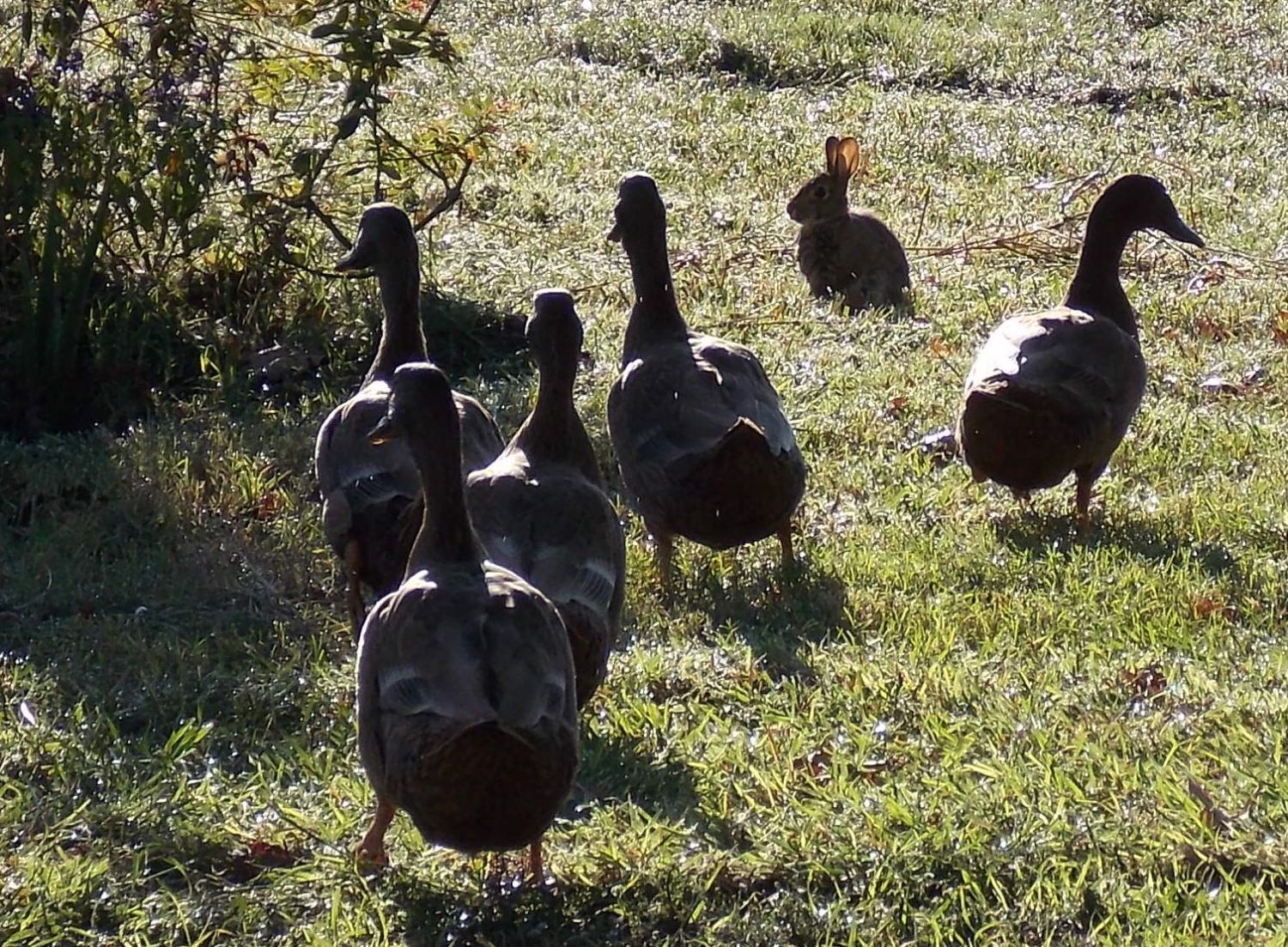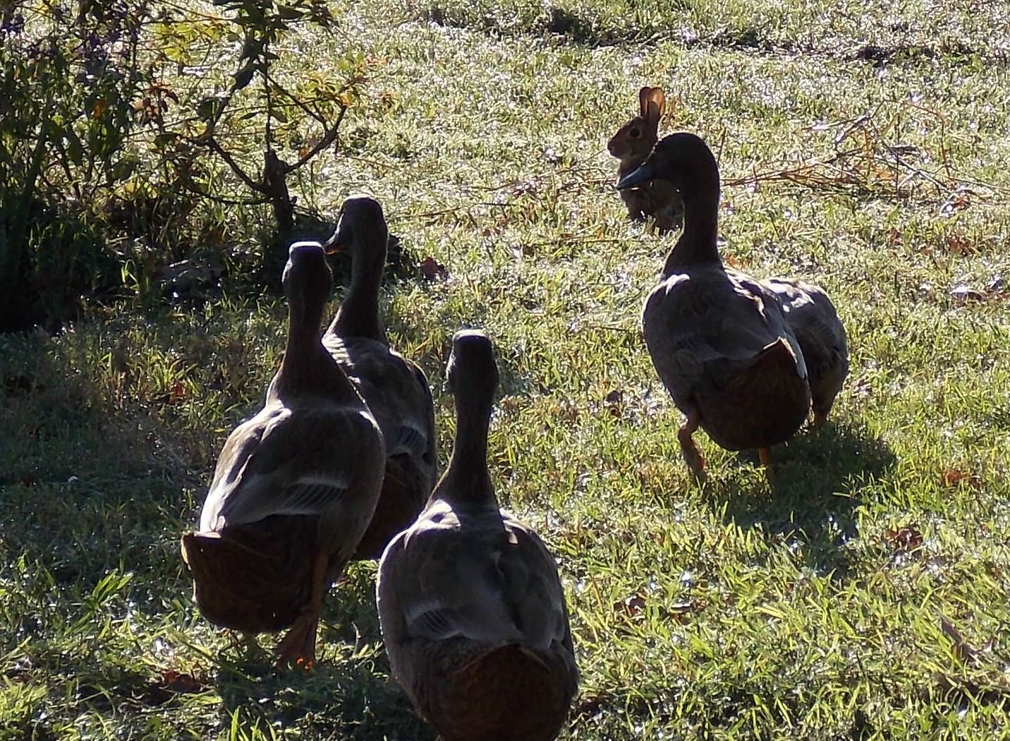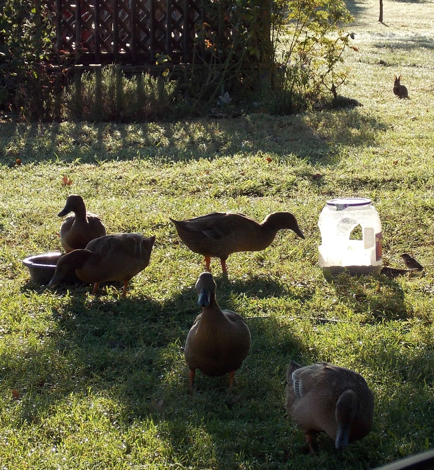 The ducks & rabbits don't seem to be afraid of each other, usually they'll just stare until the rabbit bolts. Finally had the camera out this AM and caught a little of it.