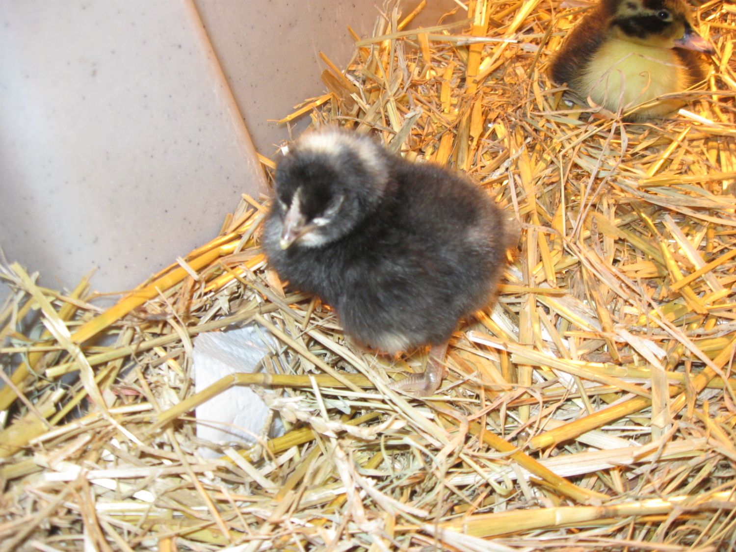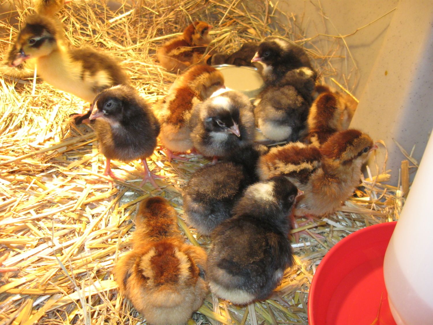 I got these in from Ideal Poultry today. I'd orders 9 Welsummer pullets, and 3 ducks. Also received 9 extras, that are apparently males included for heat. Must be a slow week. Its the black ones in question, you can see the brown Welsummers plus one of the black/white crested magpie ducks in there, too.