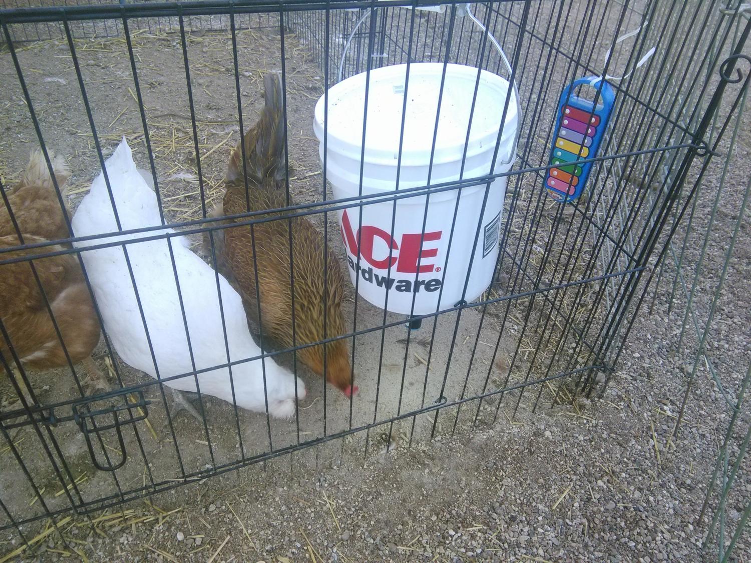 Wow! Thx for sharing! I might try the 1 gallon idea since we have only 4 hens! I space my feeders around the yard and this would be a good idea for the remote area of the yard. Did you hang the gallon inside your pen or did you use the T-bar setup in the yard like the youtube video? I was thinking to hang one from our pop-up canopy frame. I have about 5 different forms of feed for our chickens and keep the feeds separate so the chickens choose the type of feed they need/like.