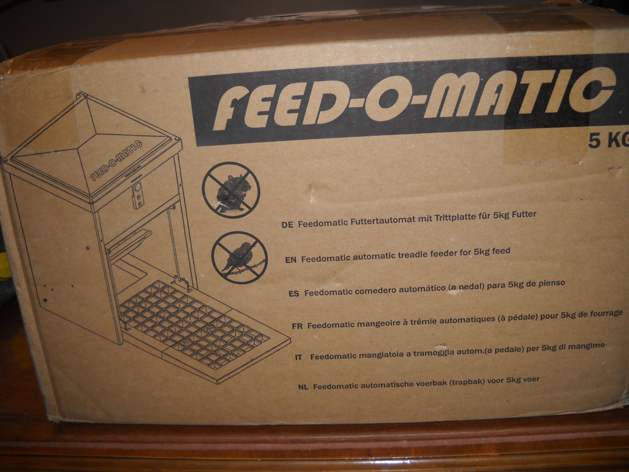 This might be the treadle feeder I use for the coop run and have the bigger ChickenCondos Chow Hound feeder in the yard. For a small feeder the Feed-O-Matic was very heavy even with the lightweight plastic parts. It's amazing how flimsy tiny screws, nuts, and bolts were used in the assembly. Hope it lasts. I went on Amazon Prime, used my $20 Amazon gift certificates, and got this shipped overnight all for $74. I'm not impressed with the plastic parts on the Feed-O-Matic just as I'm not impressed with the flimsy balsa wood treadle foot on the ChickenCondos feeder but at least we have a way to keep wild birds from eating the feed. Rent-A-Coop on Amazon shipped our Feed-O-Matic and said an assembly "video" would be sent. There was no "video" sent for assembly -- only a poor quality reprint of the same printed instructions that came with the feeder! If the ChickenCondos and Feed-O-Matic feeders fall apart at some point, I will next order Al's Rat-Proof treadle feeder to try. Seems treadle feeders all function well but the weight, assembly instructions, and chicken compatibility will tell us which one is best for us.