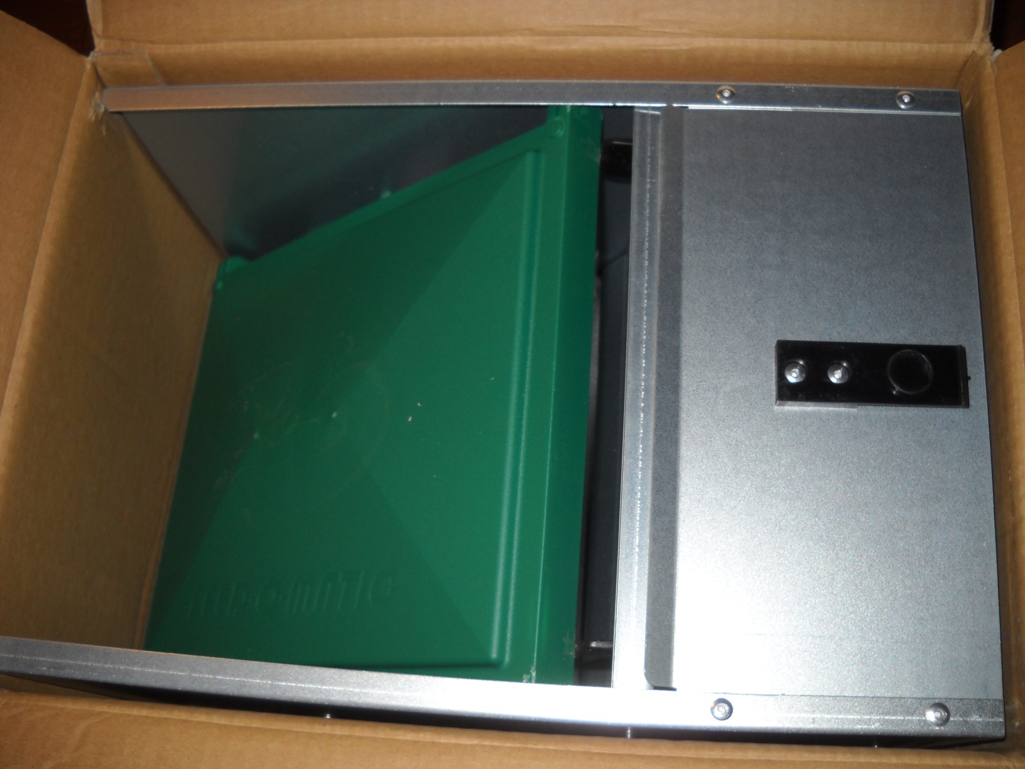 THE FEEDER IS HEAVY FOR THE SMALLEST SIZE ORDERED AND I STRUGGLED TO GET IT OUT OF THE BOX - THERE WAS NO "THIS END UP" ON THE BOX THAT I COULD FIND AND THE BEST WAY TO GET IT OUT WAS TO STAND THE BOX ON END TO PULL THE FEEDER OUT.