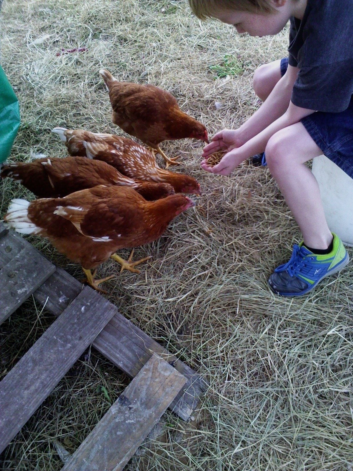 My grandson loves my chickens. He thinks they're cool. His words. He 'helped' me to clean out the coop and tend to the run this this morning. He's feeding meal worms to the chickens in this picture.