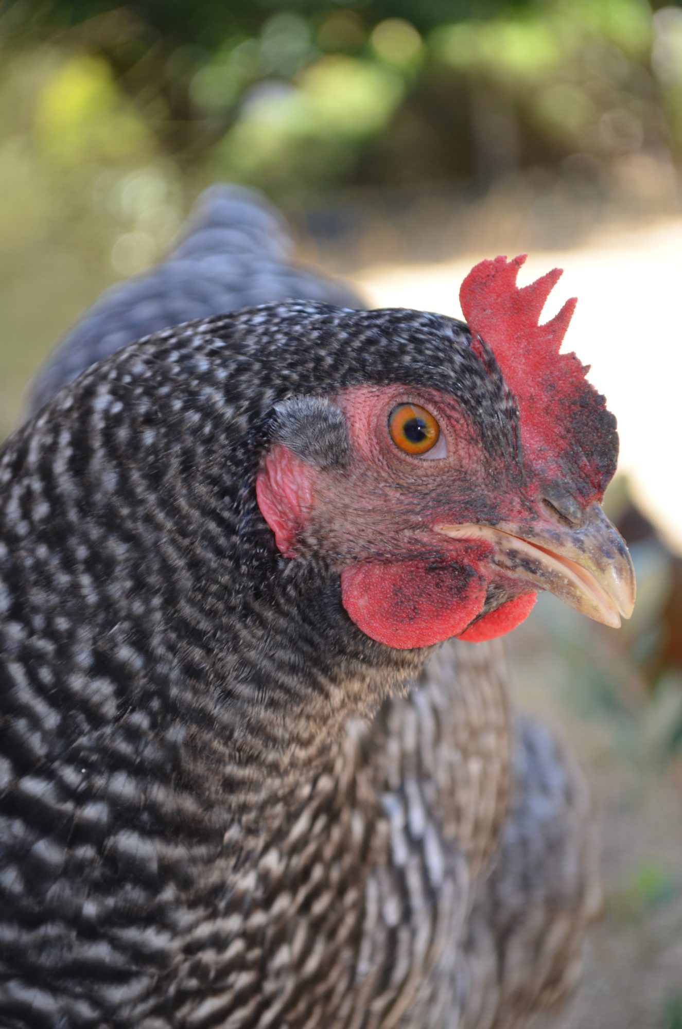 The friendliest one I ever had was a hatchery barred rock. She would talk talk talk you and follow you everywhere and jump on your lap. Such a character and she wasn't afraid of the camera. Her name was Spot. She was eating apple, so her face was dirty!