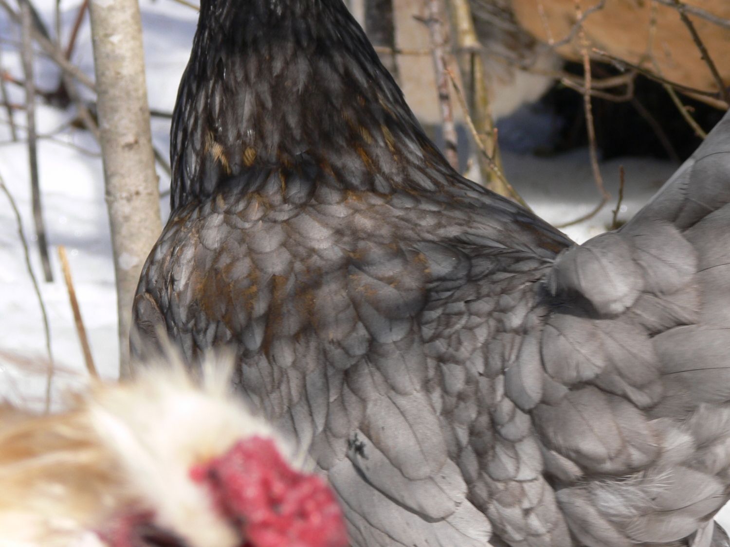 Bad pic, but it shows Bella's colouring well. She is fast becoming one of the prettiest birds in the flock, and very healthy too. She is a mutt, not sure what breeds went into the mix other than sultan a few generations back.