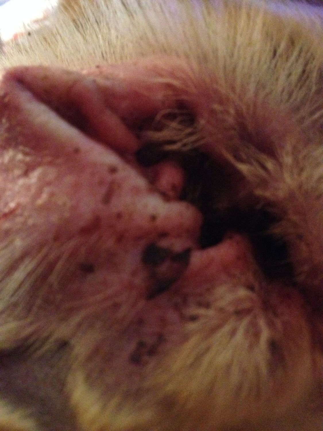 it looks red, swollen . I see white scabbing on the outer edges Its possible it could be infected . If its ear mites he has had them for a long time. I think it is but could of possibly got an infection from scratching. You need to clean as much of that gunk out as you can with a towel or washcloth No q-tips. Leave that mess for the vets .