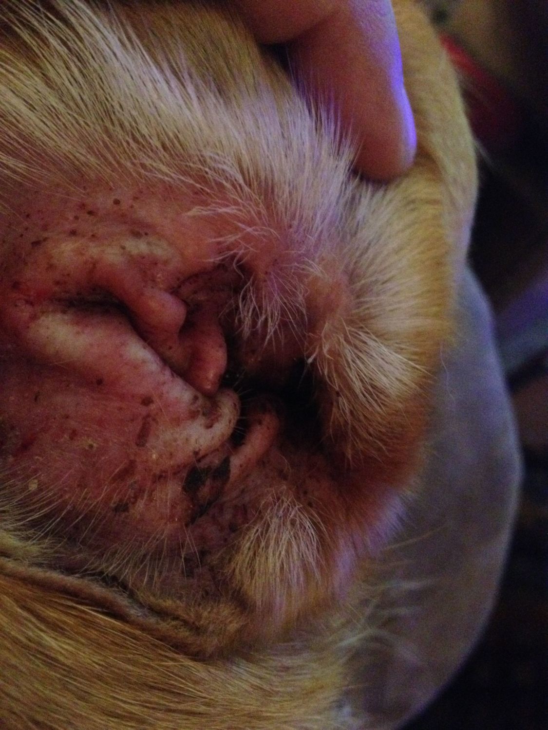 it looks red, swollen . I see white scabbing on the outer edges Its possible it could be infected . If its ear mites he has had them for a long time. I think it is but could of possibly got an infection from scratching. You need to clean as much of that gunk out as you can with a towel or washcloth No q-tips. Leave that mess for the vets .