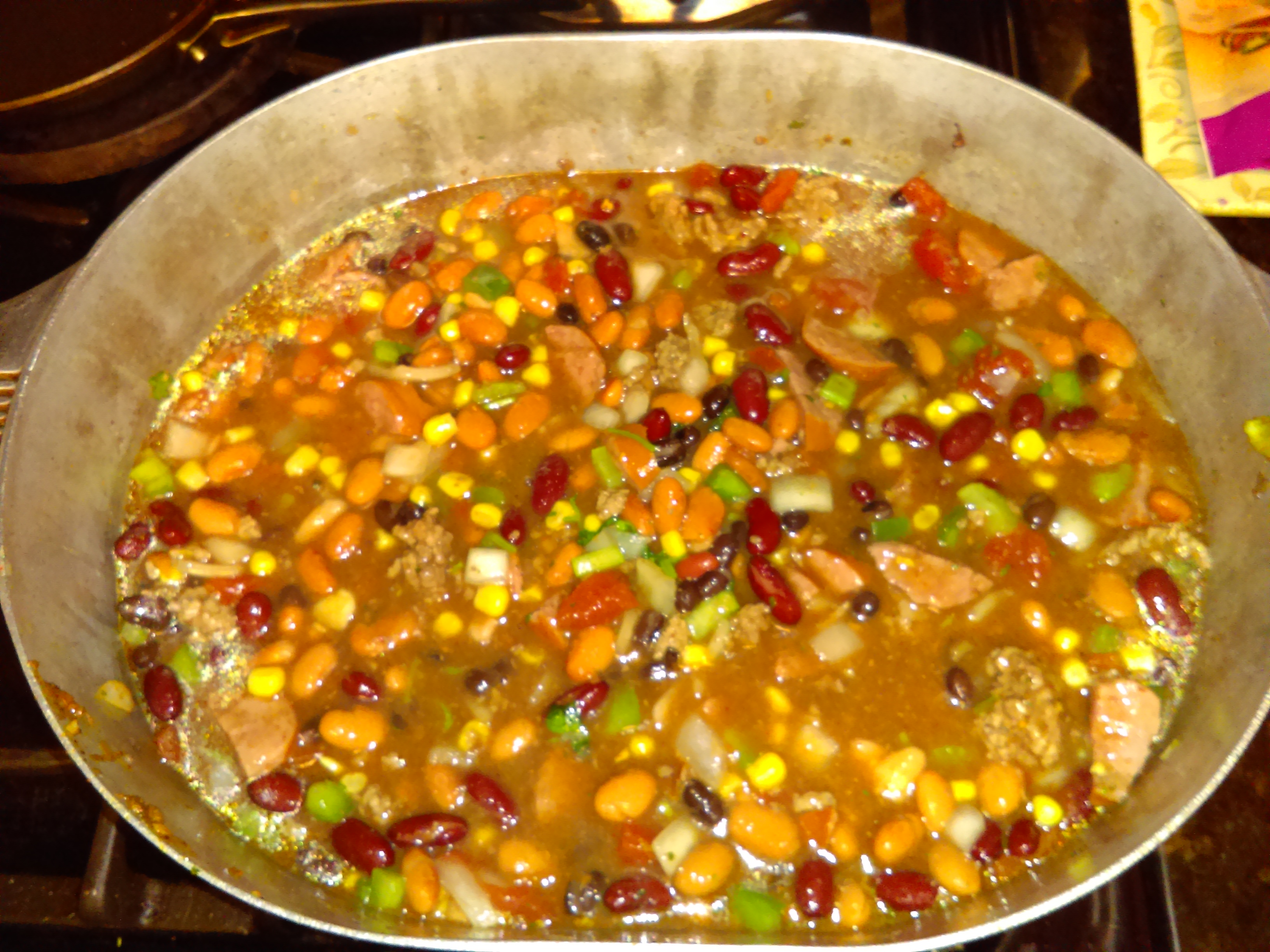Ground meat, sausage, taco seasoning, ranch dressing mix, onions, bell pepper, garlic, celery, any beans (this time I used kidney, pinto and black), any kind of tomatoes..I used can....and a can of corn.