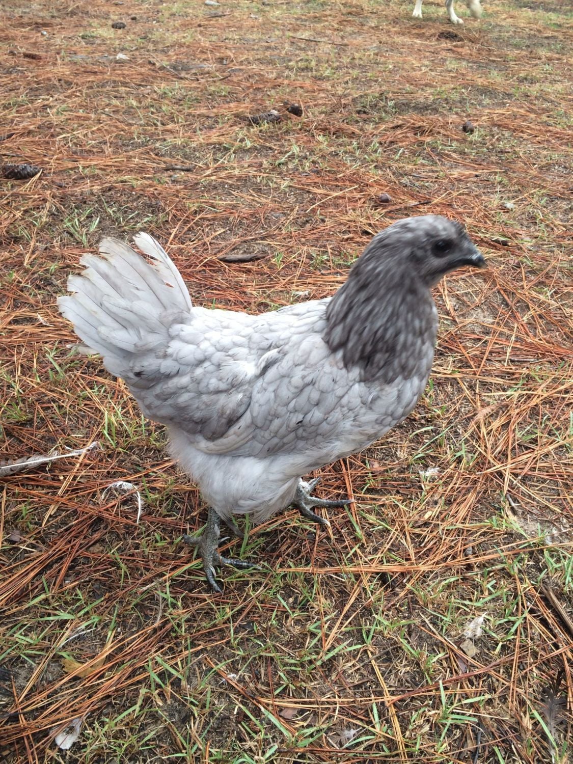 Hona/cochins. I've hatched 4 of them, 2 pullets and 2 cockerels. Both pullets have turned out with dark combs, dark eyes, and uniform blue with darker collars. Both cockerels have turned out with red combs, golden/light eyes, and this mottled/barred pattern. Svart hona roo over splash cochin hen.