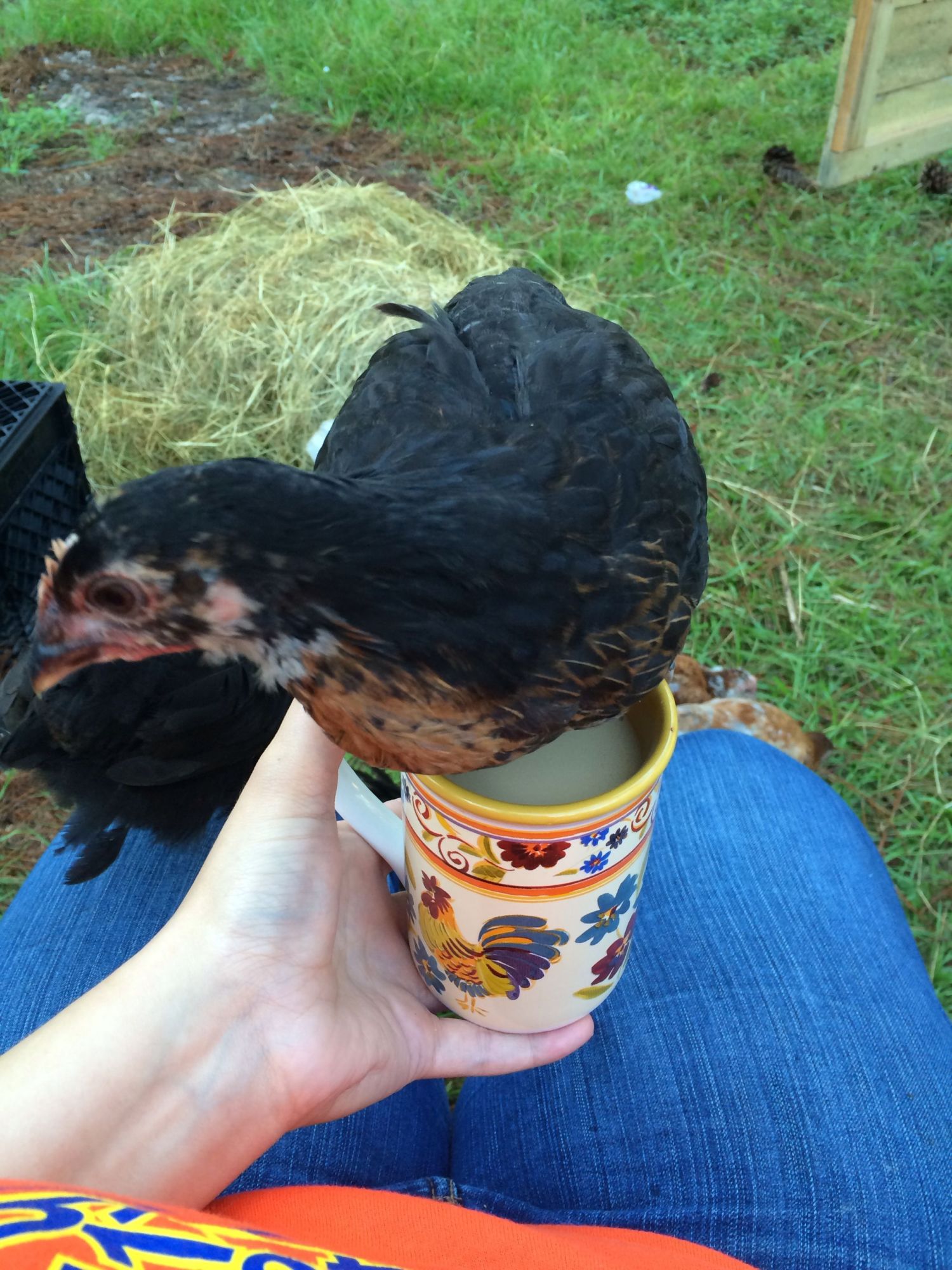 When I first decided to get chickens I wanted them to be pets more than anything. I told my best friend that my dream was to hear myself saying, "I have to drink my coffee inside because the chickens always jump in my lap."