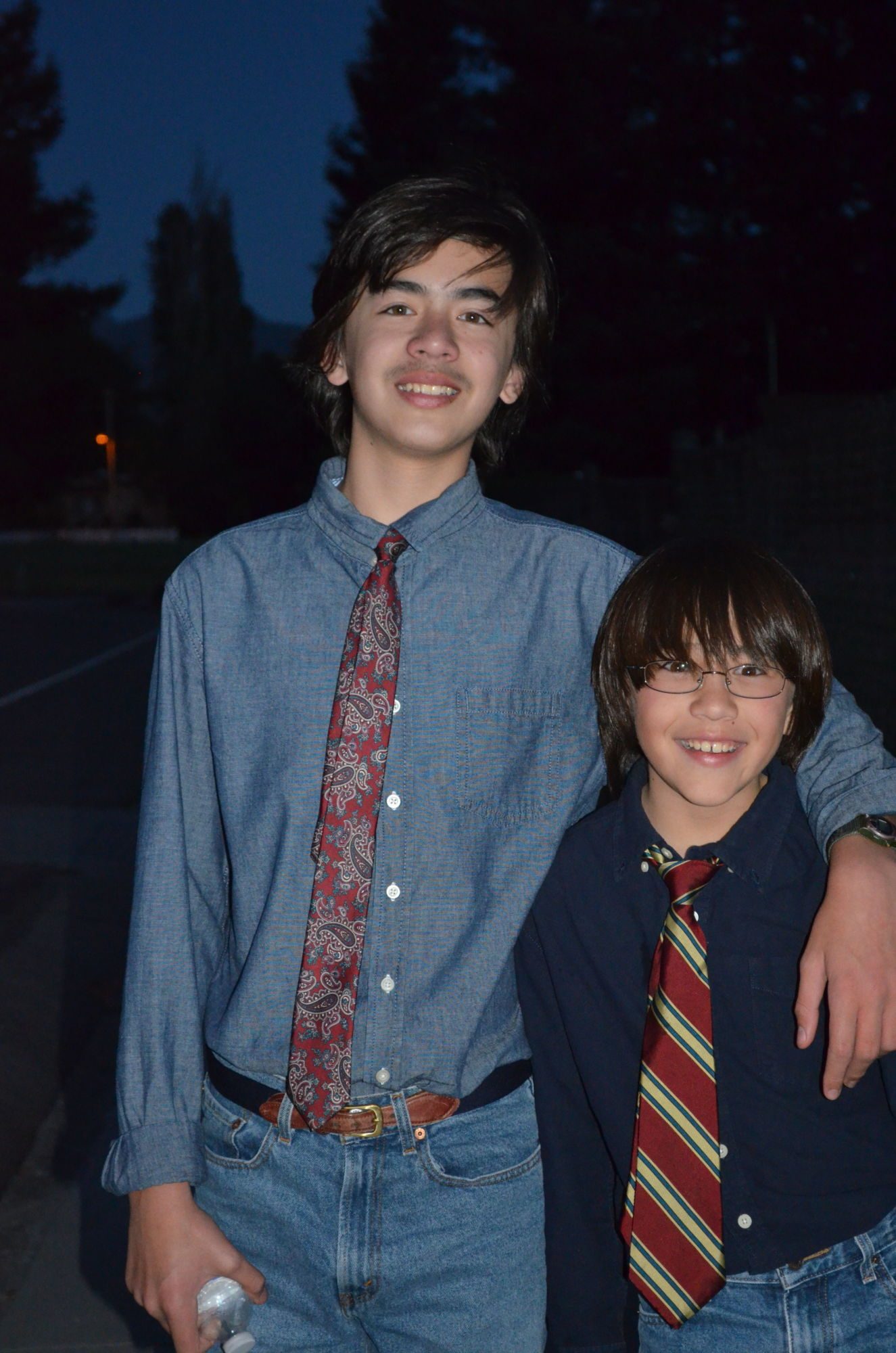 This is one of my favorite pics of them. End of 8th grade and 5th grade. (13 and 10yrs) #2 was wearing the tie we got at a thrift store for his Harry Potter Halloween costume.