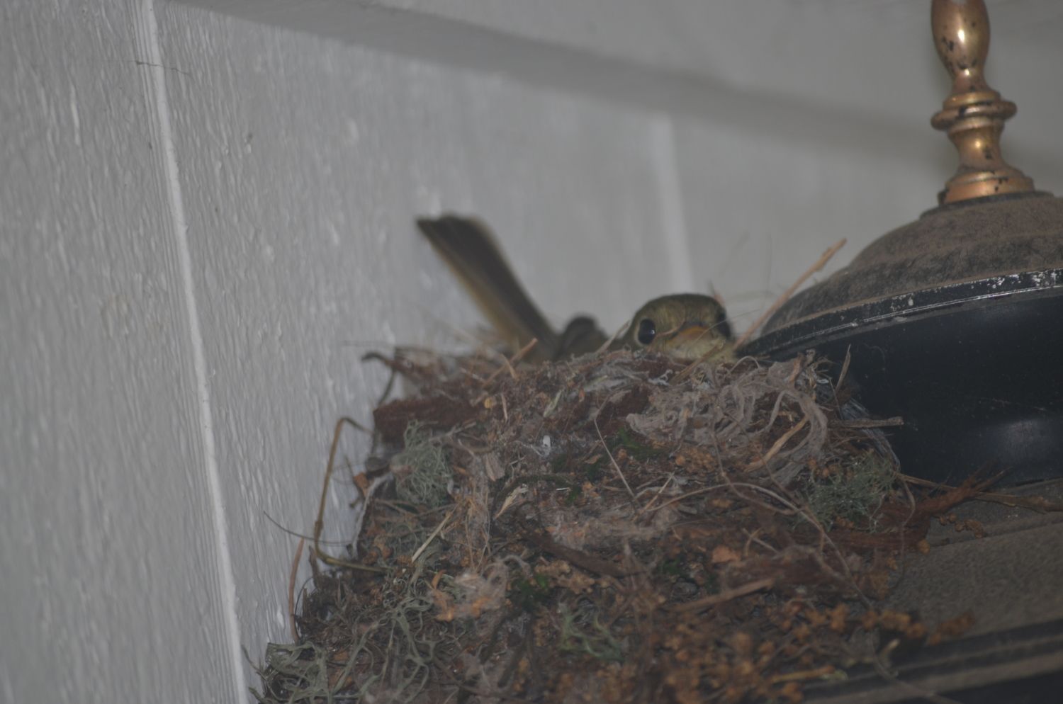 Here's the little flycatcher setting on our front porch light. No babies yet, and she's been glued on there, so maybe pretty soon. #2 took this pic with a telephoto from up on a ladder. Bird was a lot spookier then. She seems to be used to us.