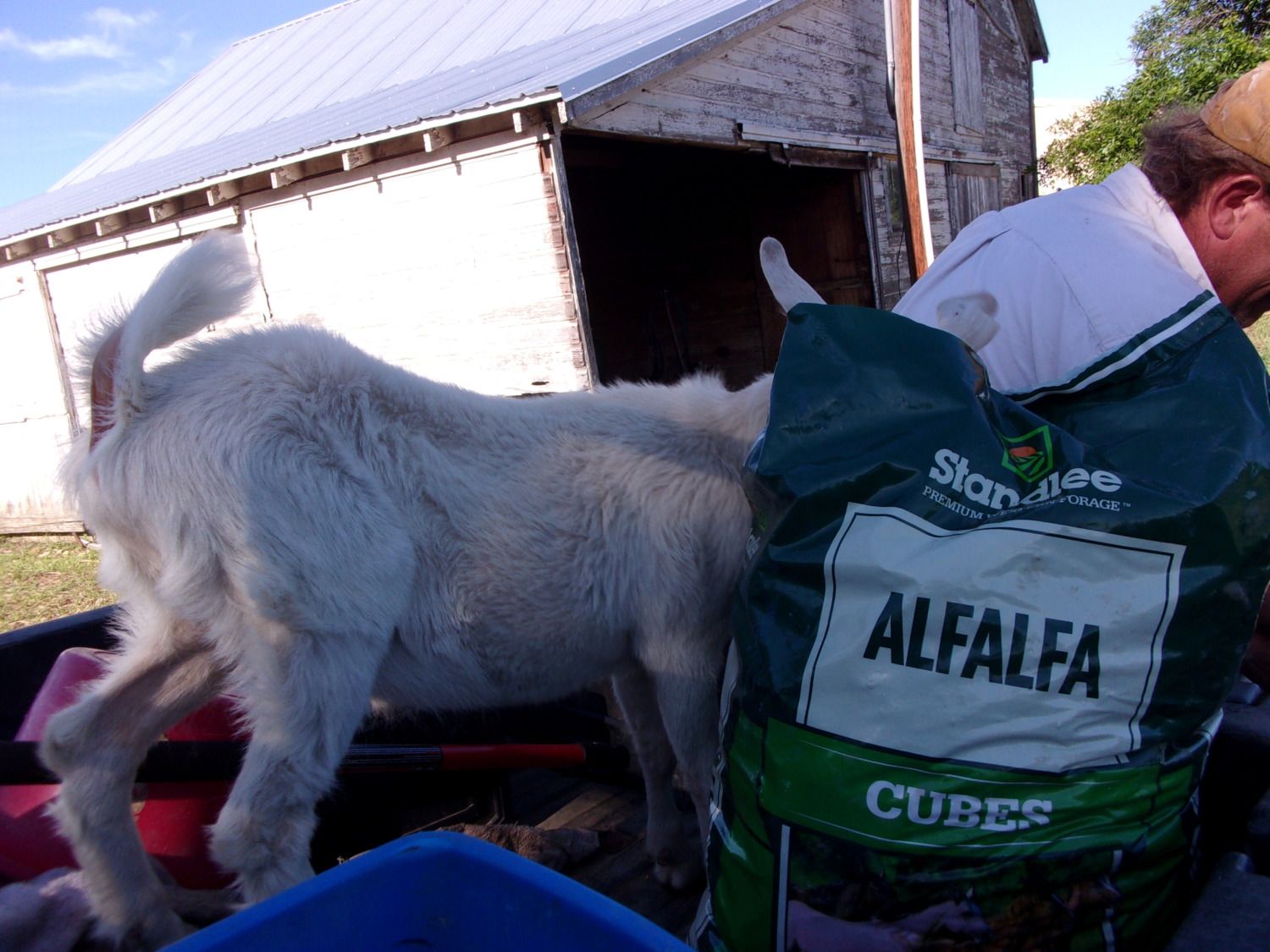 your baby chicks are big !! granny looks like she has a heart on her shoulder . LOL Like me.. are the goats all white ?