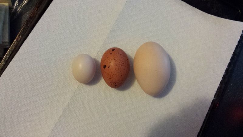 I *finally* got some good Welsummer eggs. Of the three we picked up this spring I knew at least one was laying and had been unimpressed with her egg color, but not surprised given they are "just hatchery birds" -- well, the last week has brought me four of these beauties, the picture does not do the color justice, they are the prettiest little things! (shown with the big, mis-shapen eggs our BO Fat Amy lays and the tiniest little fart egg (size of nickel) we found the other day --- DS is taking these and some others to the Ag. Day event FFA hosts for the county 3rd graders this week). Not sure if it's just one of the three or if both the remaining two are going to be nice, dark layers - haven't been able to stalk them in the nests well enough to figure that out yet - have been really pleased with the personalities they have developed since they started to lay, they've become quite friendly.