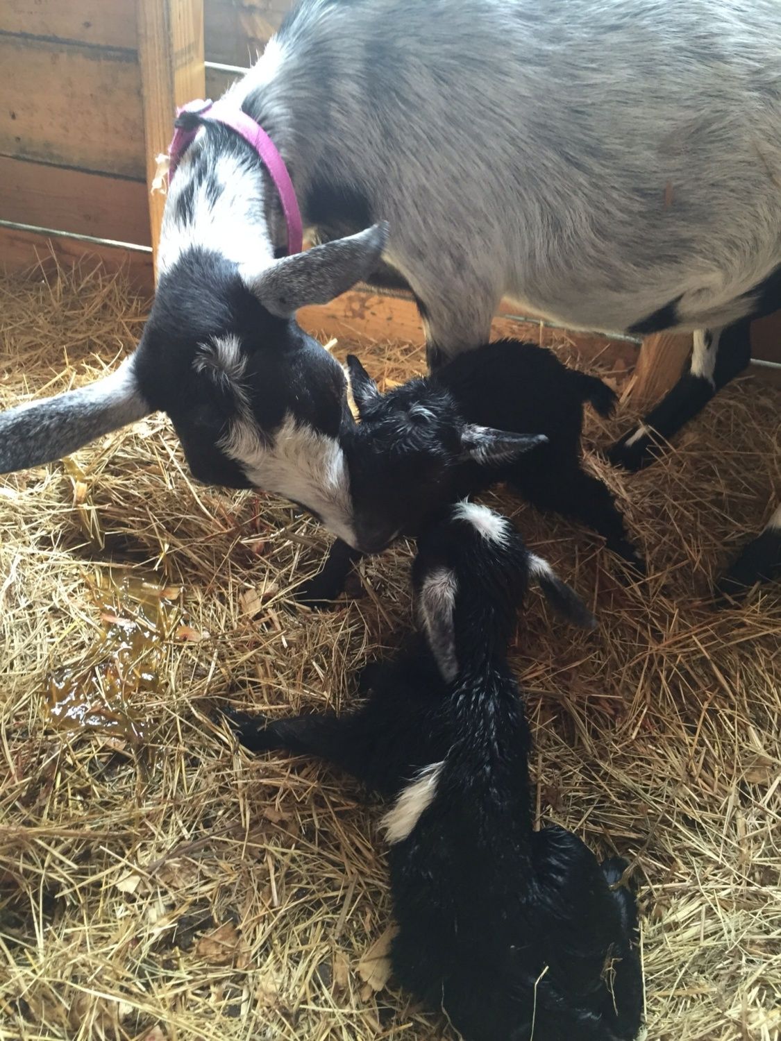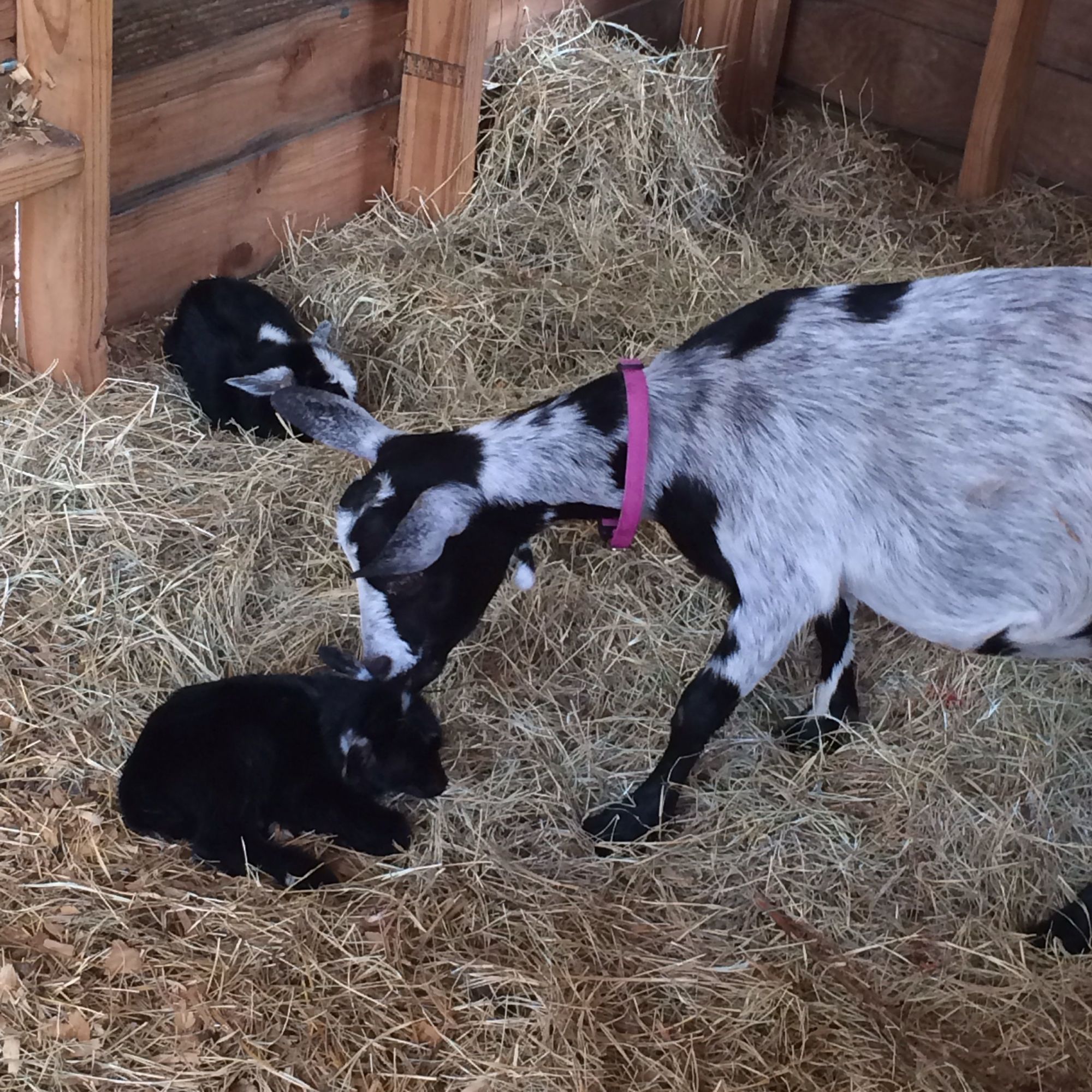 I can't check them every two hours right now because we have a HUGE group of kids and I've got 1-2 helpers, depending on the meal. Stretched pretty thin. The boy was laying by the door this morning, and an hour later he hadn't moved and the nanny was nudging him with her nose. He's less vigorous than the doeling. I went and put him at a teat and he drank a bit, then switched and drank a bit more. I also saw him pee for a surprising amount of time.