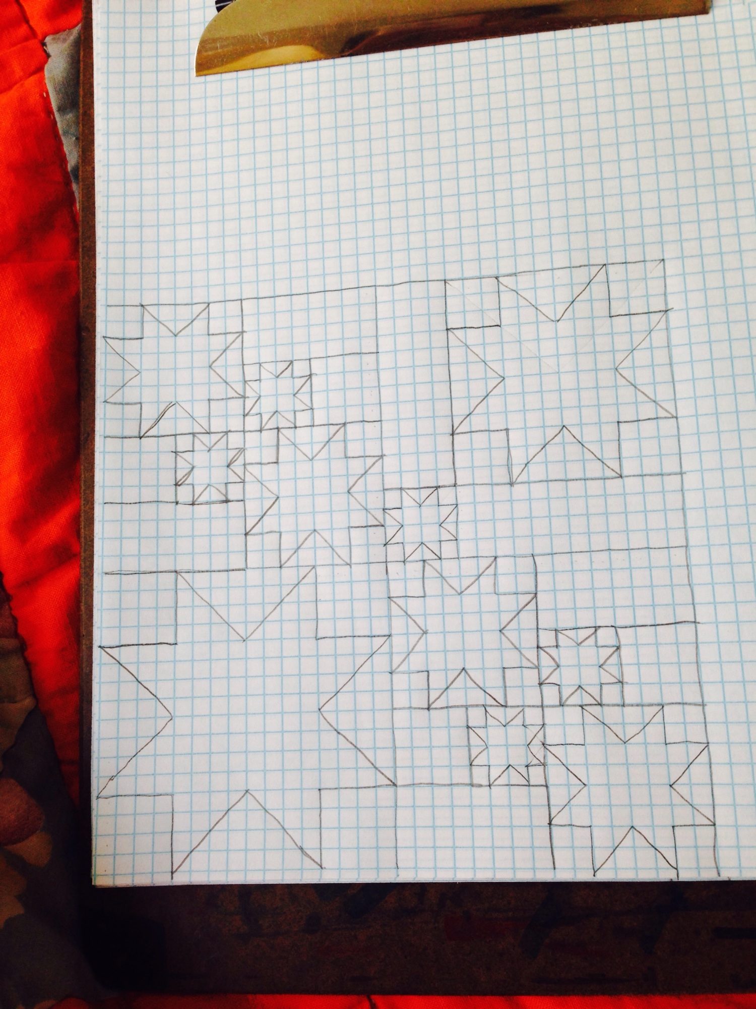 Dh spent 2 days organizing out storage bldg. i found the box & bag of material i had been looking for. I want to start a new quilt. I haven t quilted since we ve been home from virginia. Hard to do with a little one, gd around. I think im going to do a star quilt. I have red, white, blue& gold material. Will make 16, 12, 8, & 4" stars & organize them to make 16" quilt blocks. Got to draw it out on graph paper.