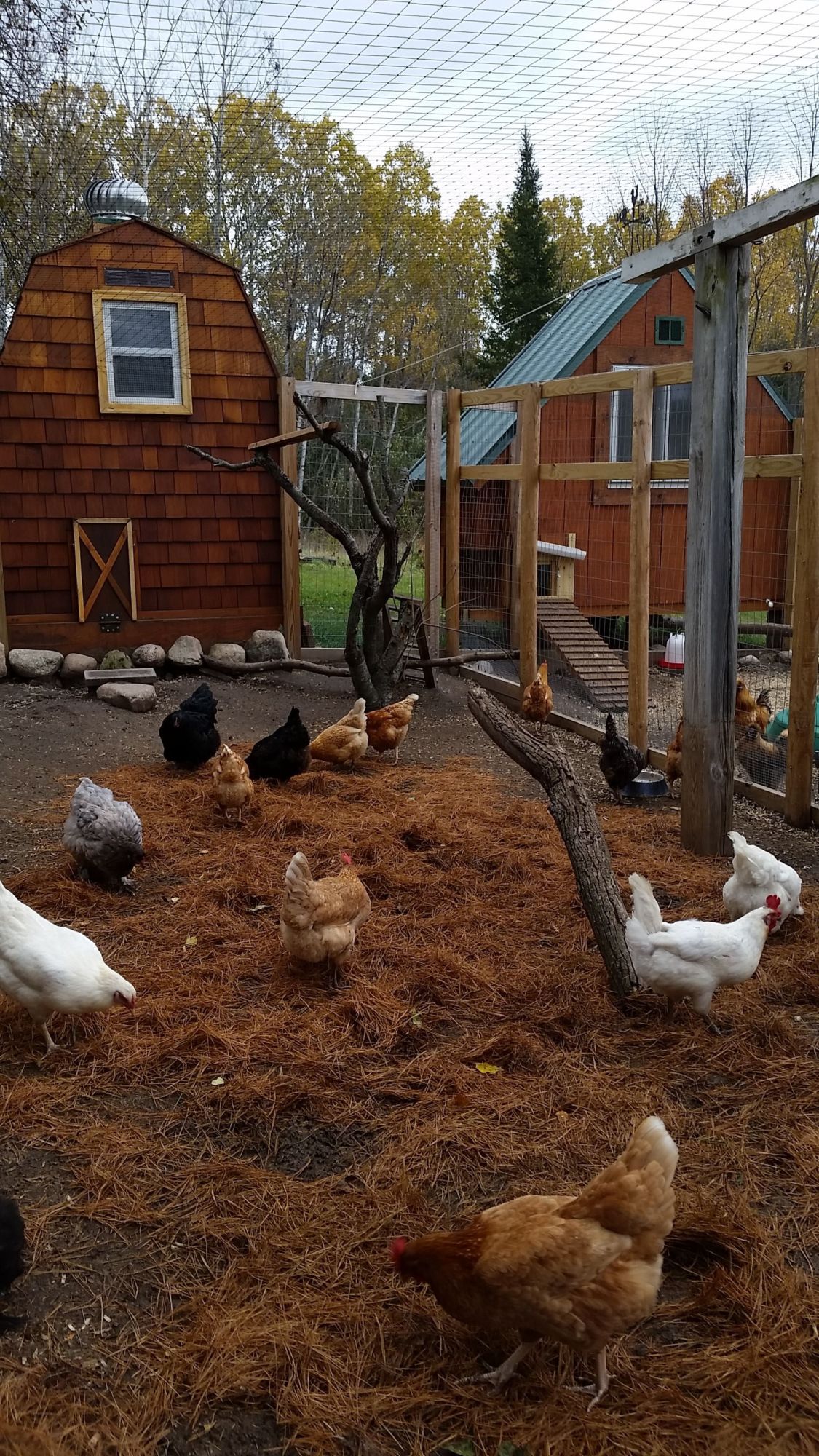 Ok, who wants to see pictures?? Ha Ha, even if you don't your gunna :lau The kids having fun in the pine needles. I figured if they can't free range anymore, that I would bring the tree to them. Coop on the left is our very first coop hubby