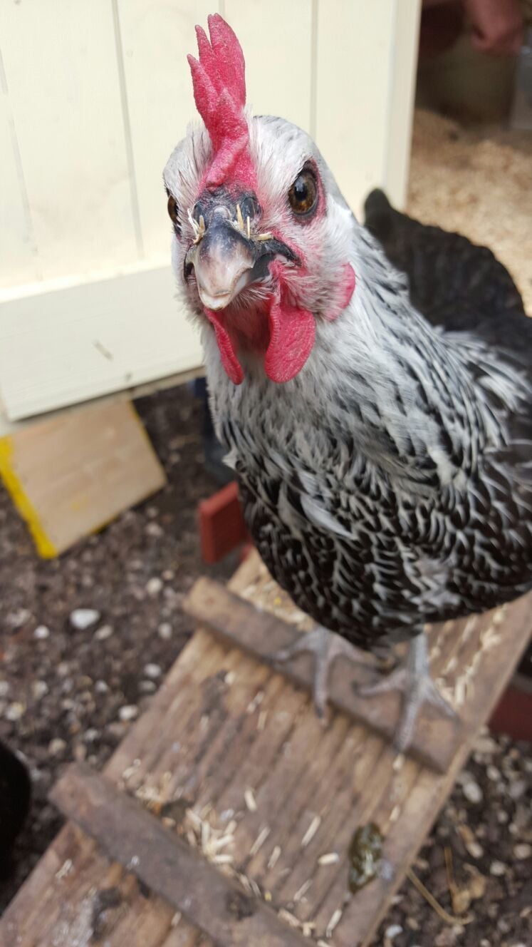 any way this is my boss hen hattie shes not the best looker but she sits on my back if i bend over shes always round my feet this is her feed me and feed me now pose t