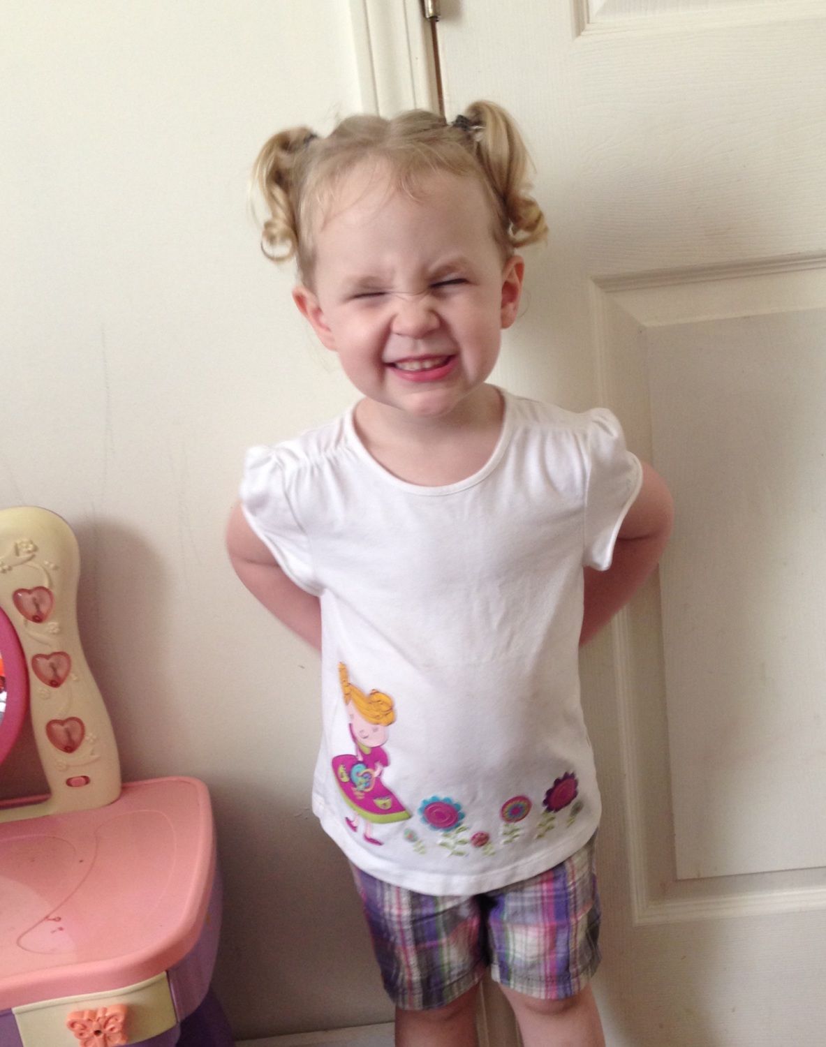 Gd chased chickens. Caught one by the flag feather. Her mom & me laughed til we cried. Here she is with her curly sue pig tails today. Oh yeah we had to come in because she was playing in mud puddle.