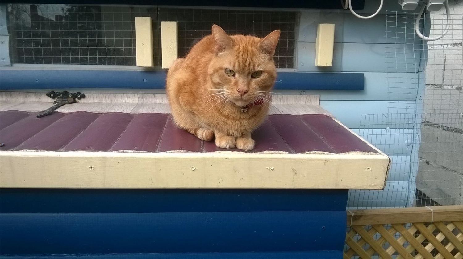 this is thomas my chicken guard cat sitting on the nest box lid he has started to hang around with the girls