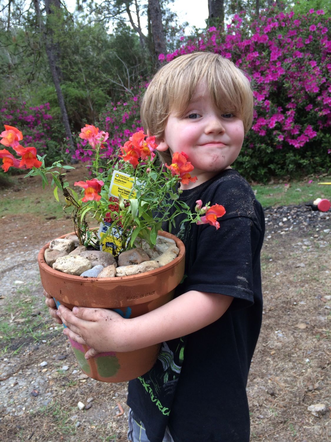 Bubba helped me do some repotting in the yard. They made pots with the "butterfly" footprint shapes last year for Mother's Day. He had a great time digging holes in the yard over where the azaleas used to be.