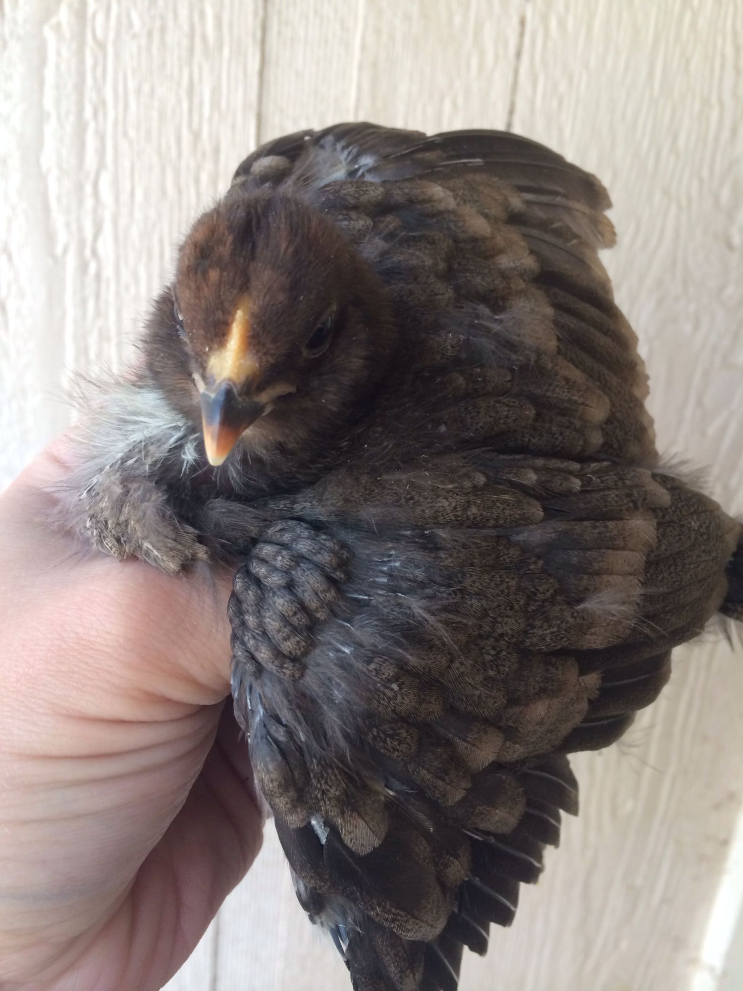 Chocolate chick from last hatch. The other one is still fuzz. Not even pin feathers.![]()