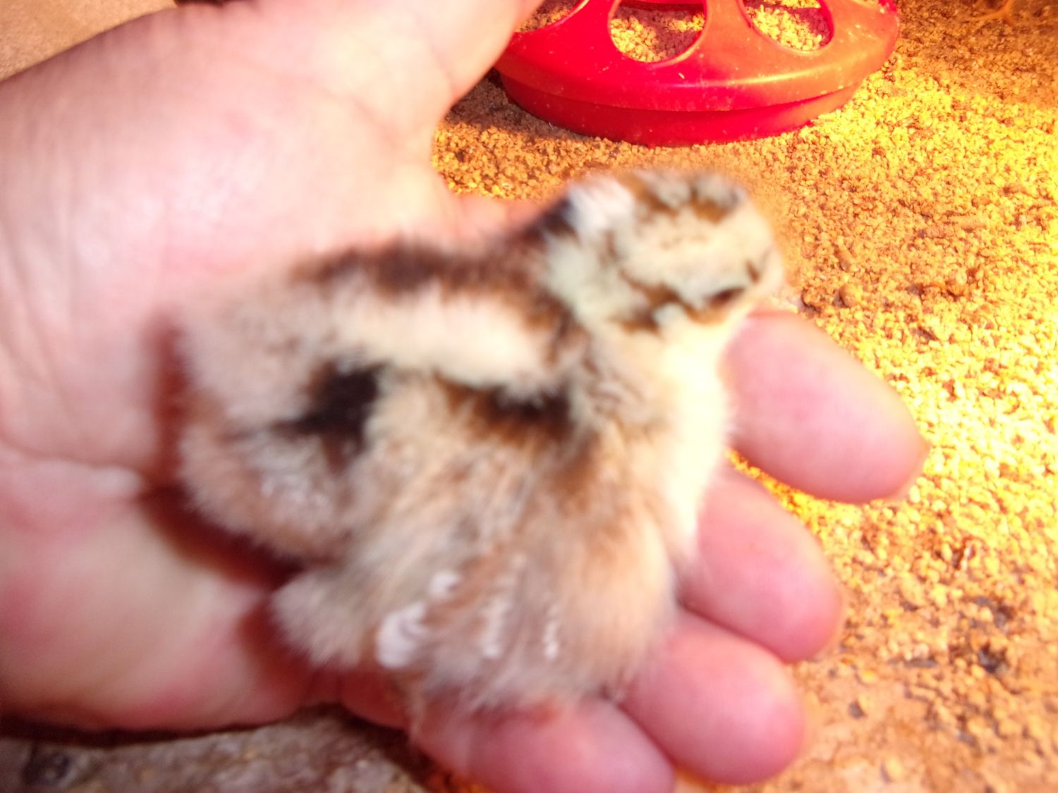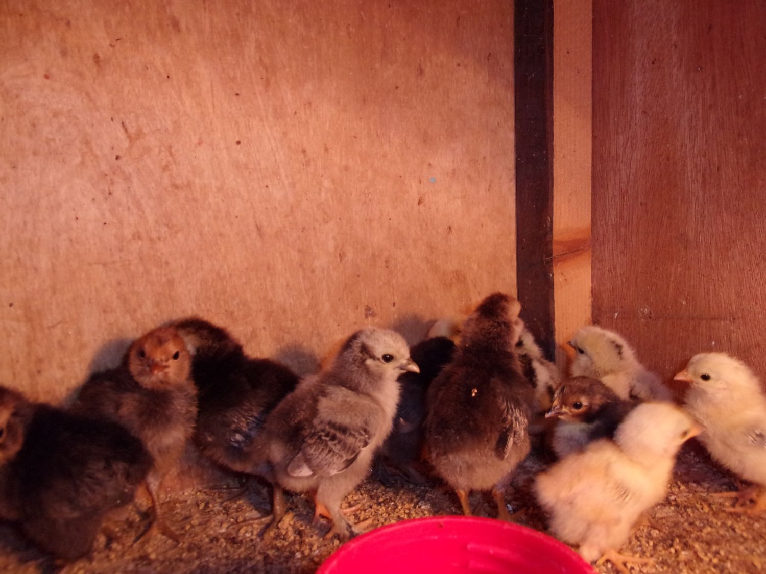 Awww. So cute! The gray chick really stands out. Wonder what it will loo like. By my theory of sexing, it's a boy because it always seems to be standing between you and the rest of the chicks. Good theory, huh? 50% chance of being correct!!