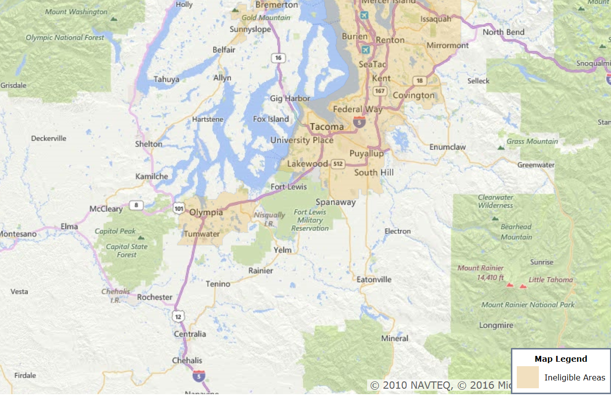 I did a little research on USDA loans and anything that is in white is eligible for USDA financing. That means you won't have to come up with any down payment. That's right. ZERO down payment.We are looking as far out as we can... Yelm rainier... Tenino areas