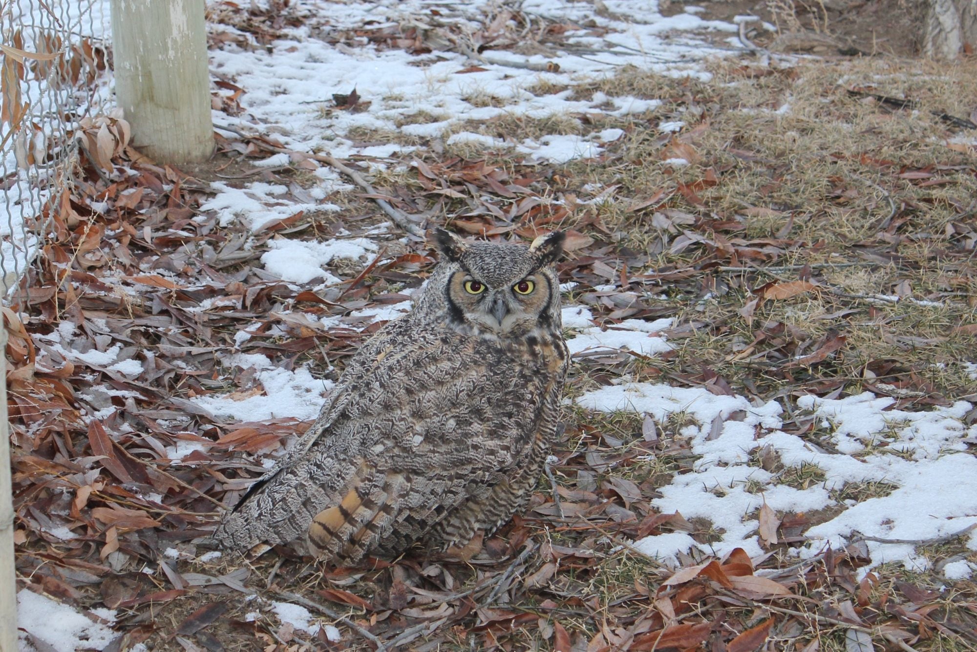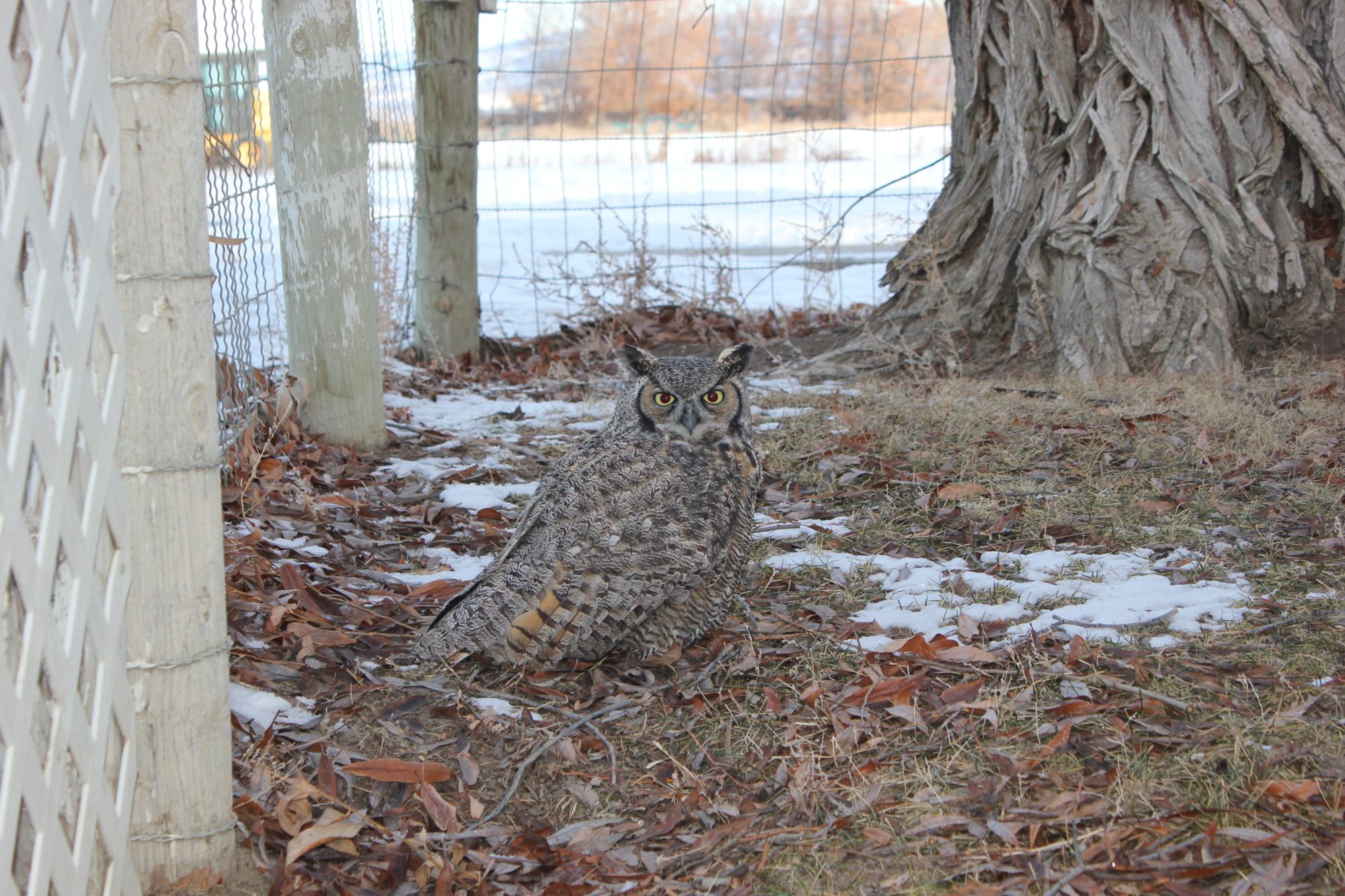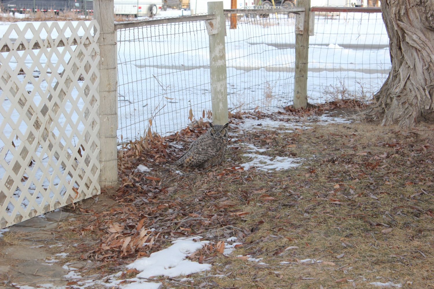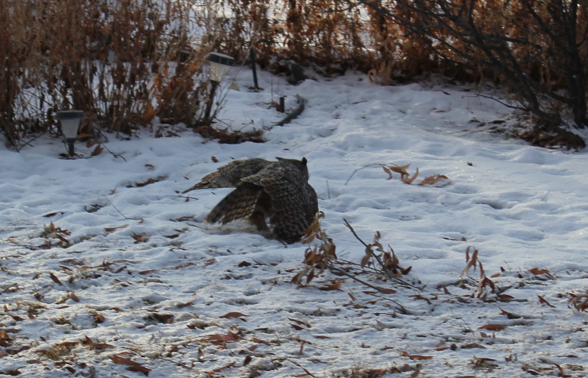 Owl came in doing recon a good 30 minutes before dark. Chickens came down of roost in response, Free-range game hen with nearly juvenile chicks went up to back of house and called young up under her skirt. Owl was perched in Black Willows but chickens and I could see it just fine. It likely chose that location to avoid any hawks that might still be active. I walked back to flush owl off until I had camera setup. A bird is properly tied down this time to keep owl in view. Slight problem is battery needs charging so I am sitting out in yard posting until battery charged.