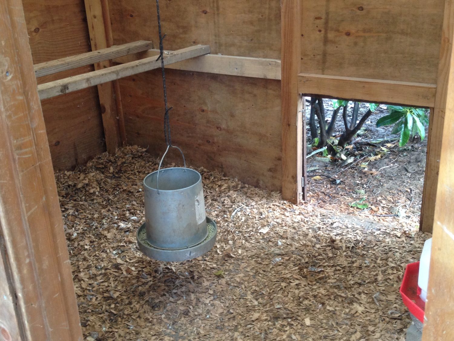 Finished view, though I cut a hole in the plastic at the end for ventilation. Most of the end of the plastic part facing the camera is a door. The roosts are pretty high, but the birds seem to cope well with that.