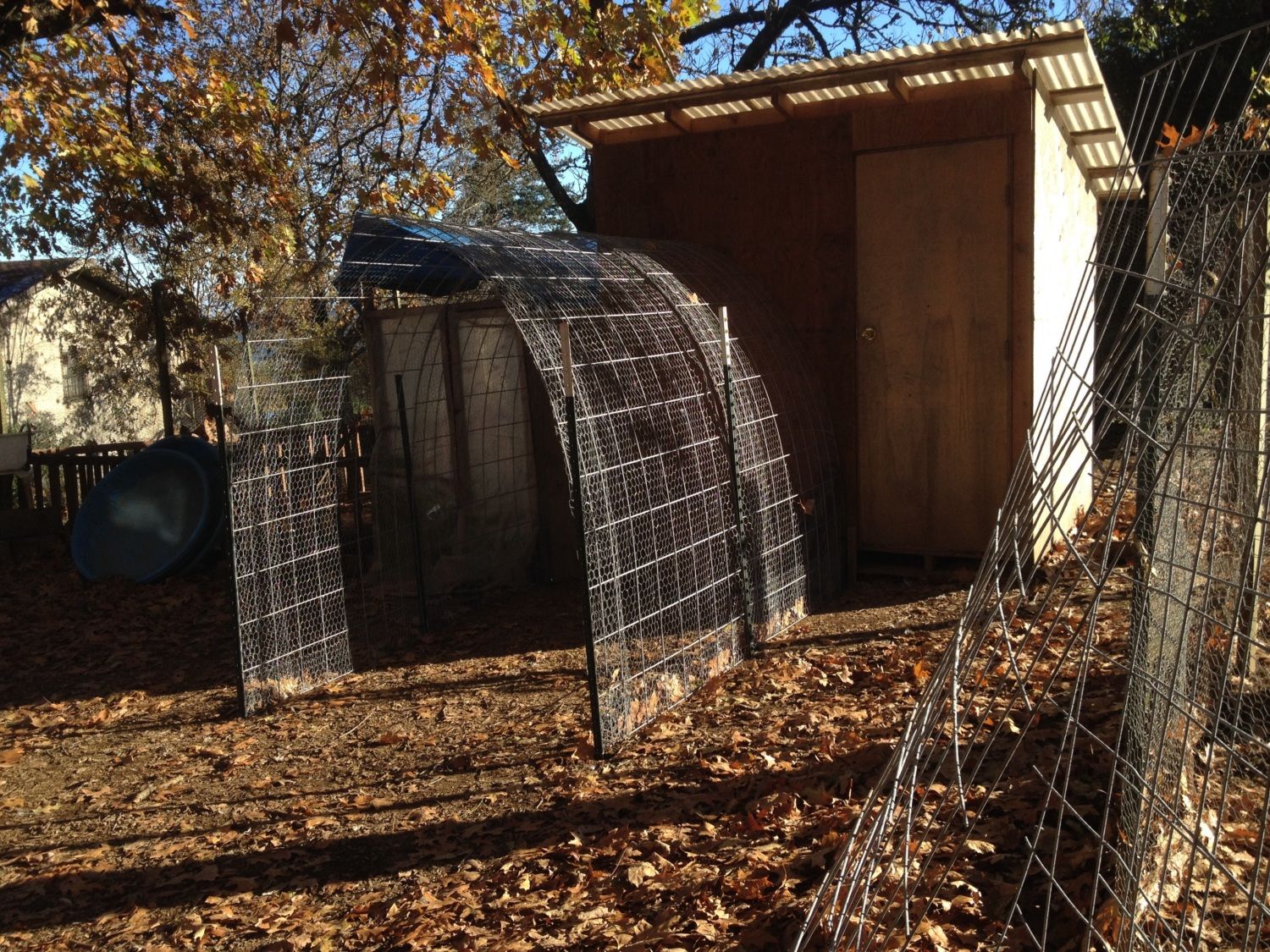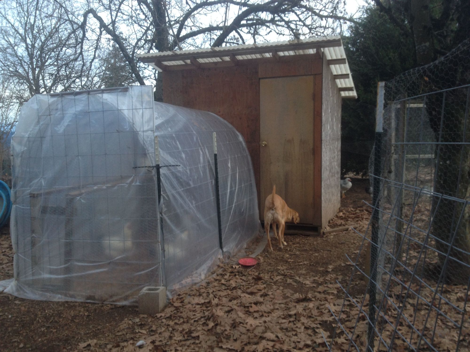 To make the coop more useful, we put an extension on it last spring so we could get more birds in it and their roosts could be over the deep litter. The extension is the plastic-covered cattle-panel hoop part in the front.
