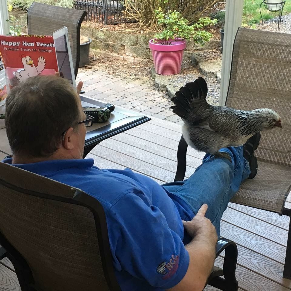 My husband Breck is a crazy chicken guy. He has a pink harness that he uses to walk the girls around in the yard and he'll go outside and just pick a girl up and carry her around. We have such a good time spoiling them and our two boxers protect them when we let them out of their coop to run around the yard. And let's face it - it's HILARIOUS when they just NEED to be SOMEWHERE ELSE RIGHT NOW!