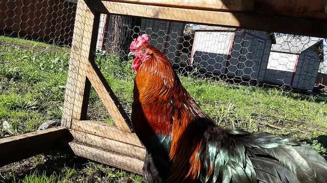 I have one rooster, if anyone knows the breed please let me know. My hen is a Leg Horn, just one for now. I'm not sure if the coop is large enough for more hens (48"x48"), any thoughts would be great. The coop is covered with plastic for the winter, I take it off when the weather gets warmer.