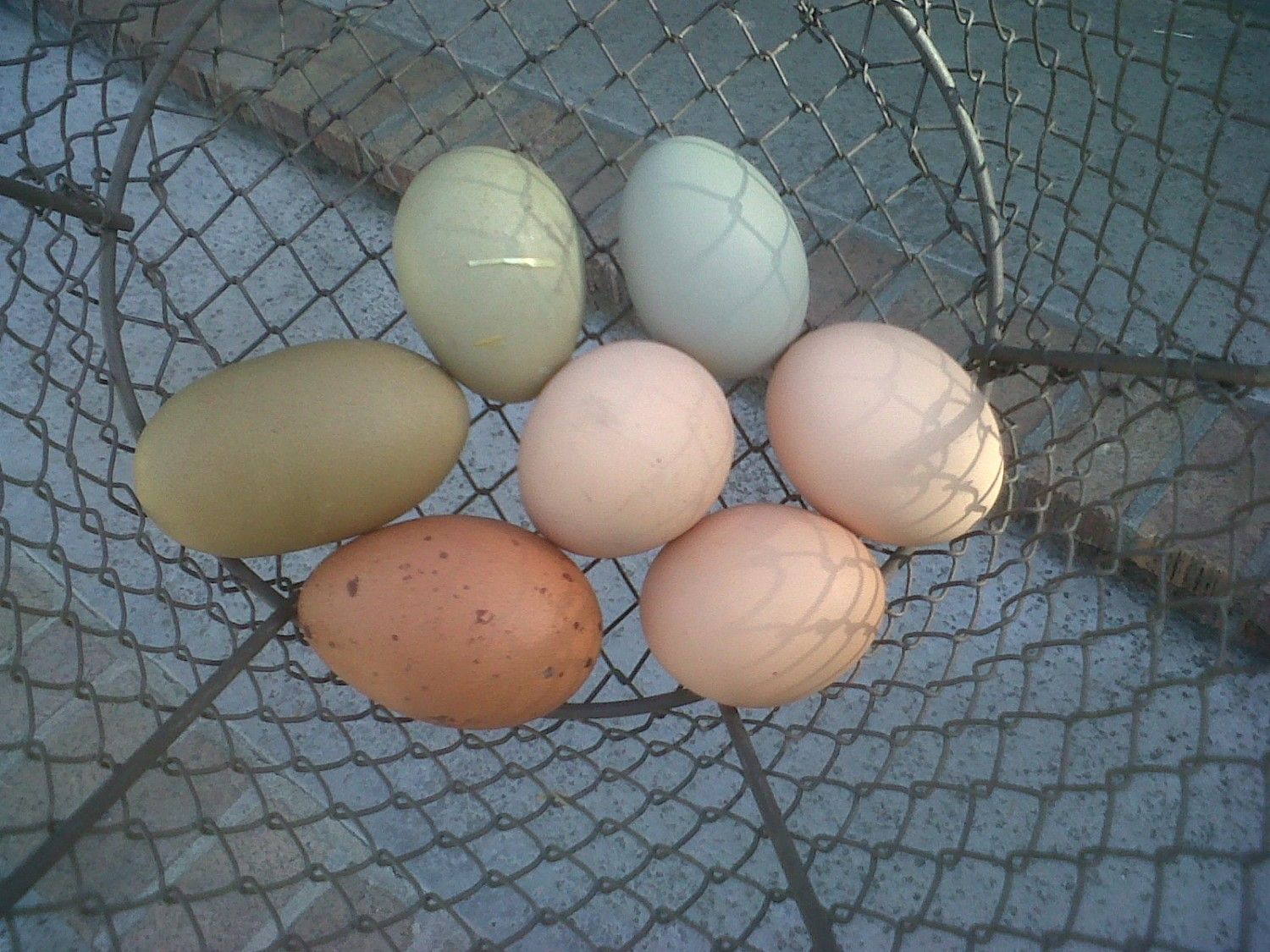 Our three new layers were broody-raised. Dad was a Welsummer and the moms were 2 EEs and another Wellie. We're pretty sure the three on the top of the picture are from those three. The two olive ones we figure are the Wellie x EE hens. The grey one (it's not as blue as it looks in the picture, it really is a grey with a slight bluish tint) we think must be from the "pure" Wellie. Do you think we're right? Both Wellies were from hatchery chicks, so I know we can't be sure they're 100% pure. Has anyone ever had a grey egg? I did some searches but came up empty. If so, you think it's the Wellie/Wellie, or is it more likely one of the olives came from her?