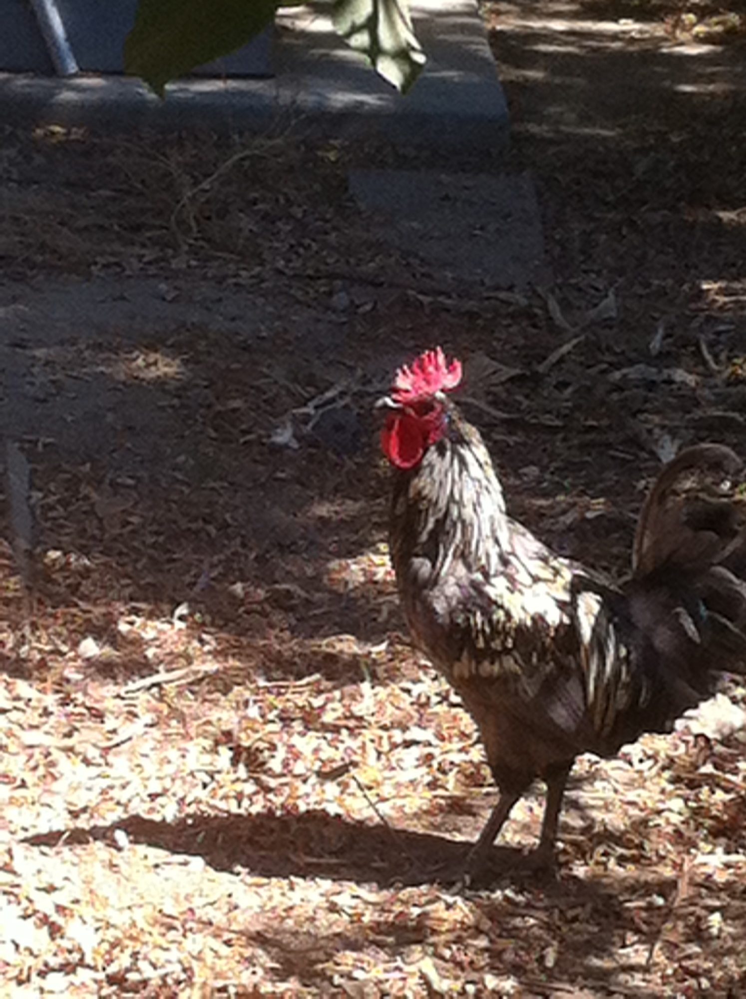 This rooster was wandering around the barn and found it's way over to my chicken run, with 5 RIR hens. He's been very sweet to the ladies and seems to have mated with one. I've seen some mean roosters and was trying to avoid it, but this boy seems very nice. I'll try to get another photo that shows his colors better - he's a beautiful various shades of grey, with light yellow accents. He's a bit more narrow than my RIRs and a bit taller. Does anyone know about his breed - mix - or any typical traits (good egg layer, etc.) Thanks!
