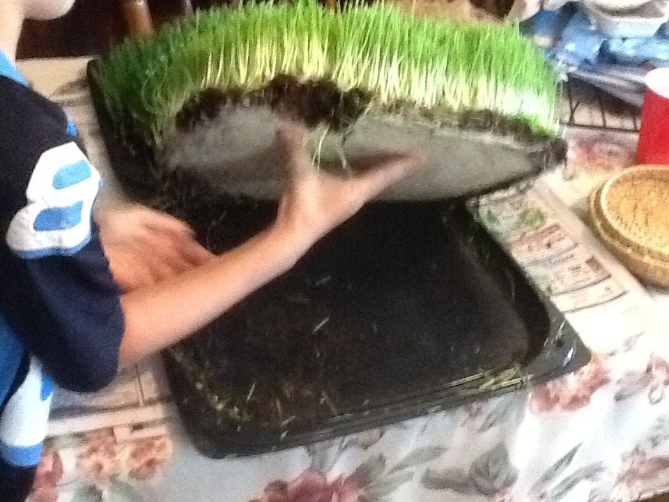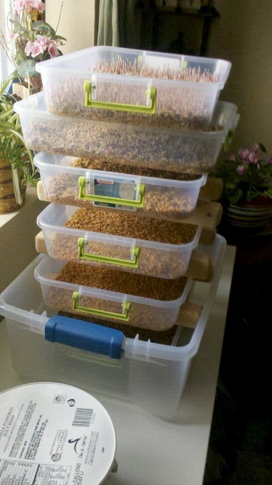 Tip your head to the left...this is my current system. I have 6 trays and 1 bucket for soaking. That covers a 7 day cycle. I think it will work well for the chickens, but it's taking me 1/2 hour twice daily to water and rotate. My thought is, I can rig a drain from the bottom drainage catch tote to a large bucket on the floor and just dump a pail of water twice daily on the top tote. That would save me lots of time, but the trays would not get rotated and the seeds/sprouts would not get the sloshing they get now. Does this beg for mold/mildew or would that be okay? They drain pretty well...any advice?