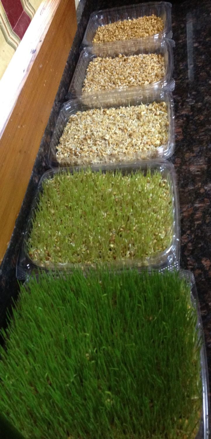 How many days from the initial soak is this?Summer wheat I sprouted for the girls, i used dirt and those furit and veggie trays you get from the market. Oh I drilled holes in the bottoms to drain the water. I have more going. It smells so good I actually have a pretty planter on the kitchen table with some growing just for me. I did let grandson MOW the wheat because it was so long so the grils would not get impacted crops, They loved it after they got over being frightened of it.