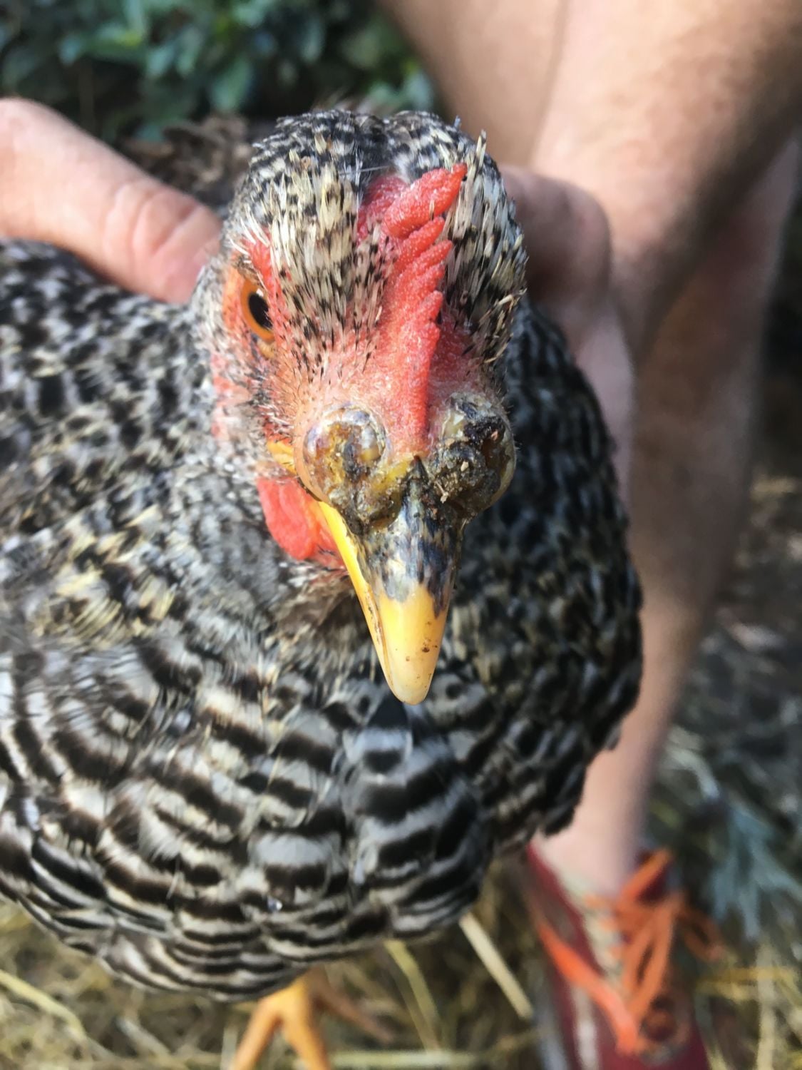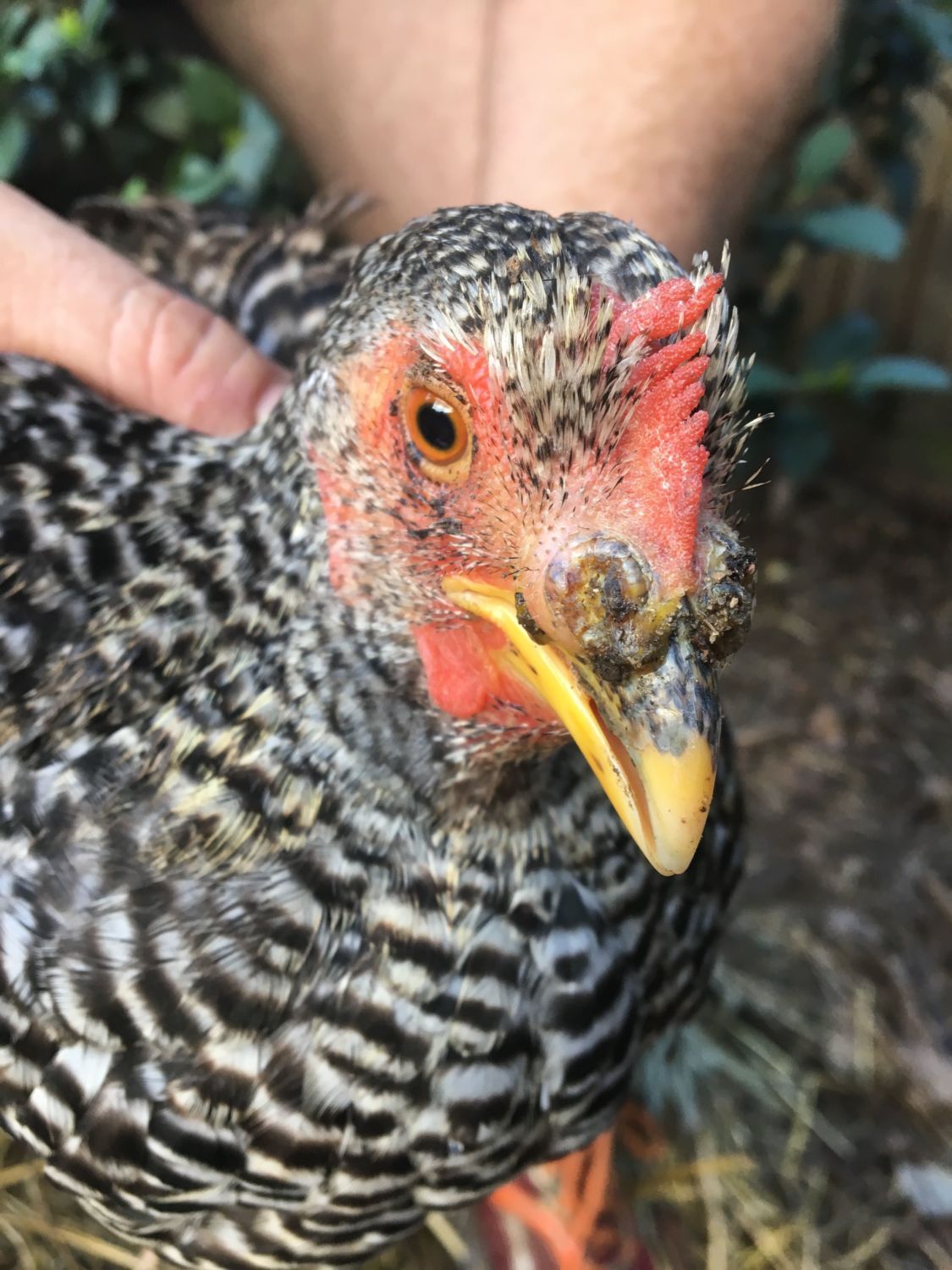 I discovered this growth on the nose of one of my Plymouth Rocks. She's only 5/6 months old, not laying yet. She seems to be fine and happy and in good health otherwise.