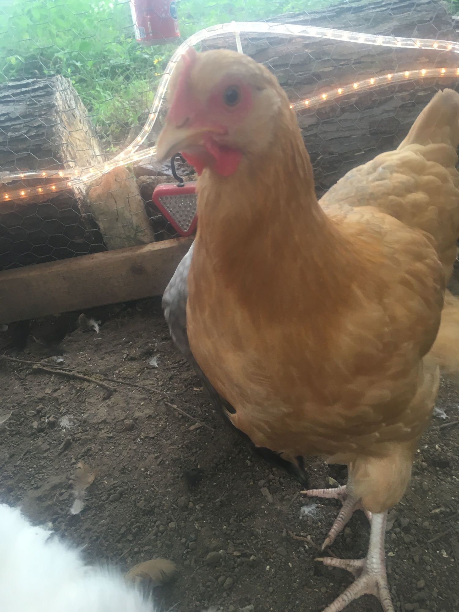 I have some 7 weeks old Orpington chicks and the boys have huge combs and wattles already. It just means your redder girl is maturing faster than your other one so will start laying first. Her comb doesn't look overly large for a pullet nearing laying. The egg song is loud clucks with a longer "bourkgarg" kinda sound at the end. You'll think something is wrong to start with as it sounds like an alarm call. Some hens do it but others just quietly go about their business.The buff has a very red comb, waddles and is now red all around its eyes. While the other buff we have is very pale colored comb and smaller waddles.