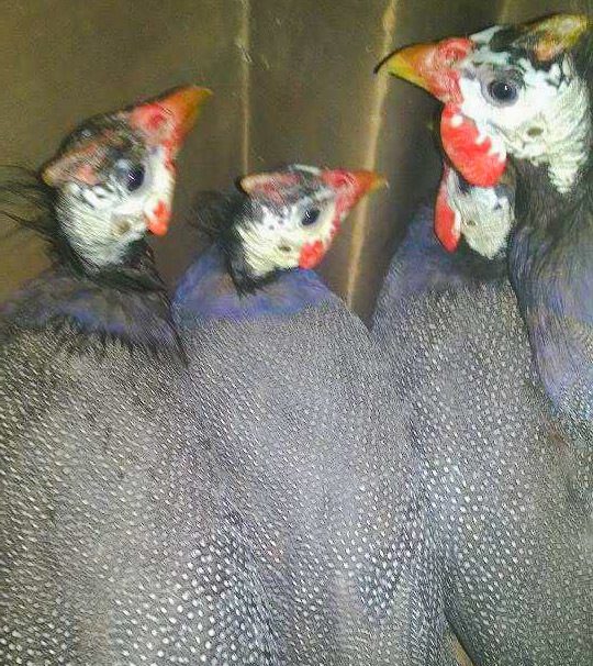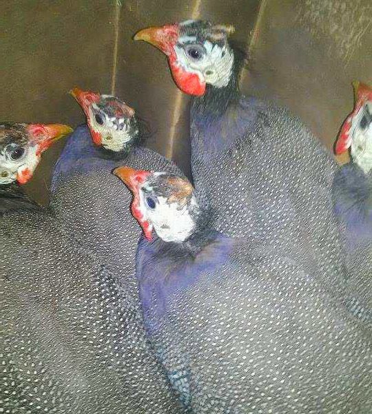 these guys are my first batch of guineas, and they are a year old now :D they looked kind of rough for a week or two molting, but their new feathers are coming in purple O.O they are normal pearl grey guinea fowl except one has a piebald wing.