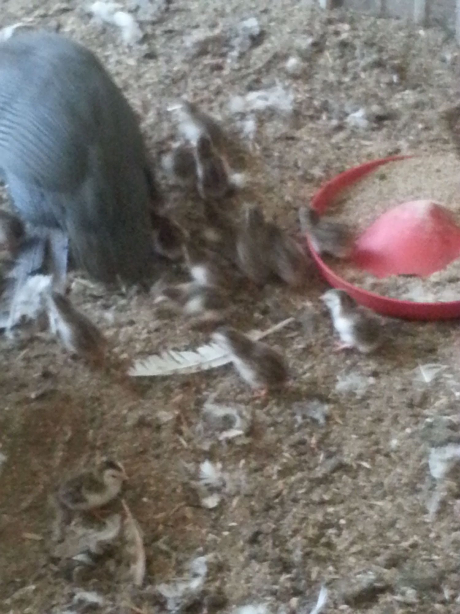 So our spotted Guinea stopped coming home at night in the beginning of June(probably 4th or 5th ish) I saw her a few times since then but she was never around long, well tonight when I went to put them away (chickens are other Guinea) she was back and being particularly evil, hissing and lunging at me when I was putting food down, i went into the inside room(we have a covered outdoor area as well as an indoor) where the nesting boxes are to collect eggs and when I went back out there where a bunch of babies running around, probably 20 or so, one of them came close to me and I picked it up and when she realized she attacked me(I learned my lesson lol). Anyway, 99% sure our other Guinea is a female also(we've had them 3 ish years and no babies before this) so I'm wondering if she could have bred with a wild bird of some sort(unless someone local has a male Guinea). Here are some pics, any ideas?