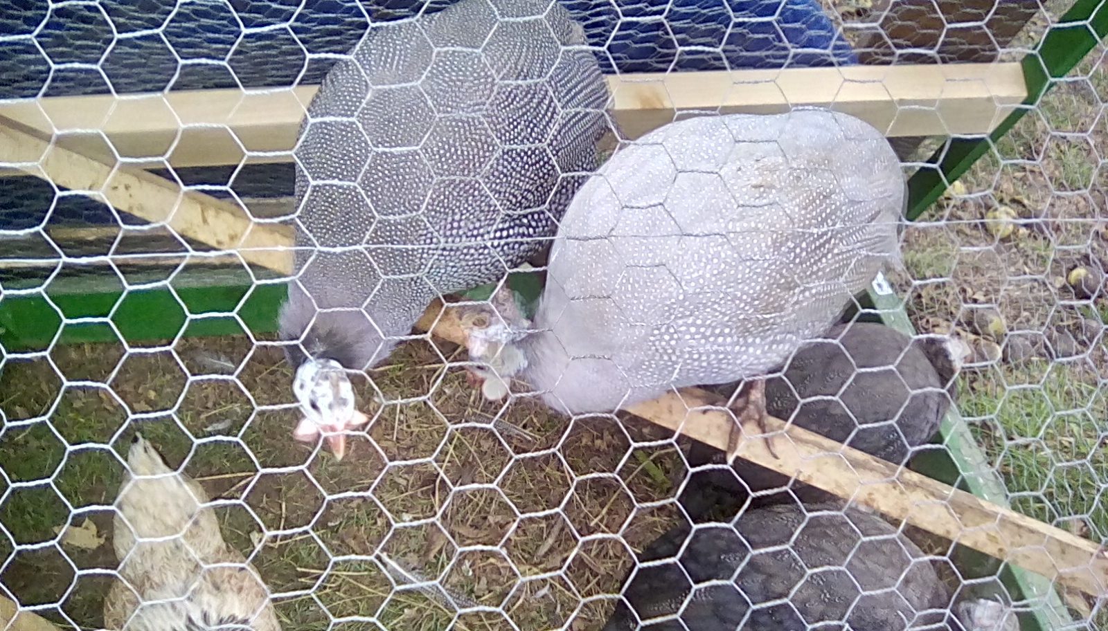 Welcome! Glad you joined us! It sounds like your guineas are pretty tame. I wish mine were that agreeable to being handled! Your guineas sound almost as docile as Pattyhen's (on this thread) who come into her house for tea!Hi everyone, I am new to raising guineas. My fiance and I got four babies this year back in June or July they now have their adult voices in and are starting to show whos boss with who. I got lucky and picked them out at a week old and nailed two cockerels and two hens, one of my cockerels is a powder blue, I have a brown cockerel as well and my two hens are piebalds they have yet to show their full adult plumage in but the markings on their feathers are far and in between with piebald marking feet. It took a while for them to adjust with my chickens but they are doing well after I got rid of my roosters who would terrorize everyone even me. The two chicken hens are never far from the guineas and vice versa. Right now they are in the process of a see no touch with my turkey flock and hopefully before the weather dips to cold they will be commingling together in the large coop and out of the temp A-frame home they are in right now. They get fed wet adult food, i tried them on dry and all of my birds stick their beaks and bills up to it due to remembering how their chick starter was always fermented, They get a daily dose of freedom for a few hours with me watching for hawks and other predators while they get to stretch their wings and play with the turkeys, which is doing better than their first encounter as chicks. Fresh veggies and fruits with a treat of stale bread or small pancakes that my family doesn't finish. I enjoy having them each one has their own personality. The brown and blue ones on the perch in the image below are my boys, Charlie on the left and Blue on the right, Charlie is a big time momma's boy he will go to my fiance James but tends to like me holding him a little more where Blue is a daddies boy. The girls are pictured below with the chicken hens, Echo is next to my Brahma cross and Delta is next to my Wellsummer. As the girls grew older it was getting harder to tell them apart so I added a zippy around Delta's leg so I can see who is who when its time to lock up. Delta bird is my gossip girl she will talk to you until your ears turn blue where as Echo is so quiet you think so isn't there, unless both males are screaming at whatever their displeasure is, example is me taking one out and clipping wings or doing a mite check/treatment.![]()