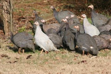 Well, so the latest is that the birds "let themselves out" yesterday. After all my delay somehow the door fell open and the 5 adults and about 26 of the 39 young birds took off and started foraging as one flock. I scared the remaining young birds over into the smaller part of the loft and locked them in so I could keep them in but still leave the door open so the escaped birds could return. The adult guineas were seen to be trying to get the younger birds to fly up to the loft...much too early to roost but maybe just to teach them how to do it. My big fear had been that either the older birds would leave and go back to the neighbor's or worse...they'd lead the young birds over there with them. Instead the older birds put themselves up in the loft to roost but the 26 young birds did not return. I wandered all over with a flashlight and couldn't find them anywhere. Luckily, they all showed up this morning (I might have lost a few but I couldn't seem to count them) and all the birds free-ranged all day. I spent the morning building additional free-standing perches to "stair-step" the young birds up into the loft. I was worried that they were a bit too fat and unconditioned to fly up to the main perch that leads into the loft. I waited until I felt that they should have roosted before disturbing them only to find zero birds in the loft. Instead of the younger birds following the older, more experienced birds the older birds had followed the clueless young birds and were smack-dab in the middle of a field as the darkness settled in. I herded them over to the barn where the older birds seemed to very meticulously use the stair-step perches as if they were showing the younger birds what to do despite the fact that they have no trouble flying up to the main perch. The young birds apparently really were too fat and unconditioned to fly up to the main perch from the ground (about 8') as a few struggled to try it. They very slowly moved up from the ground to each successive perch but eventually it got too dark for them to see and some of them were stuck out on the perches and appeared to be settling in to roost. I managed to pluck a few up by hand and put them into the loft. Then I turned the lights on in the barn and herded the last 6 or so into the barn. I turned the lights off and had to try and keep my flashlight beams from giving them a chance to use the light to find a hiding spot. Eventually I found them all (there's a lot of stuff stored in the barn so they weren't all that easy to find once they had scattered). So, tonight they are all in the loft and since I'll be out of town for a few days I locked them in. When I get back I'll try letting them out in the evening so they don't have time to roam too far and I'll just have to be there as the sun sets to make sure that they are on the right track. Eventually they should figure it out.